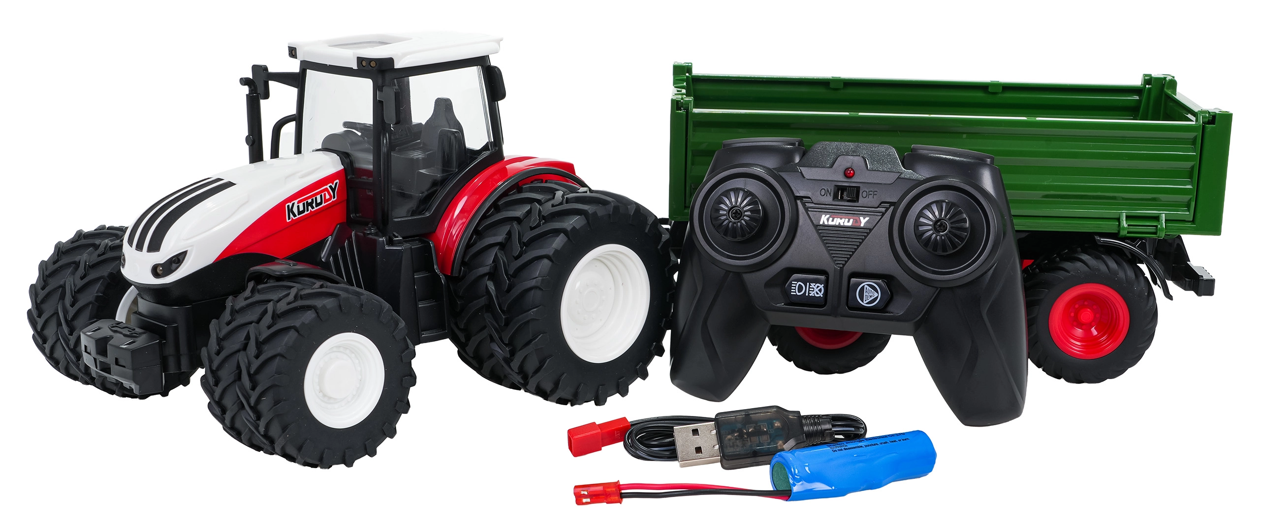 - traktor haagisega, 2,4 GHz pult, 3,7 V aku, USB-laadimiskaabel