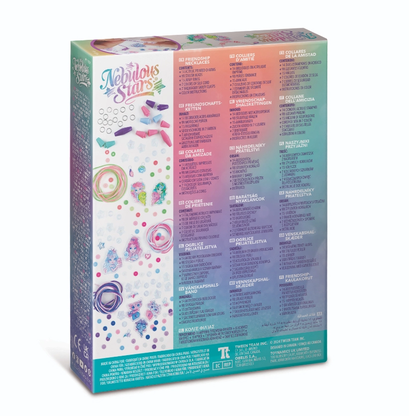 Avasta meisterdamise lummus NEBULOUS STARS loovkomplektiga. Pakendist leiad kõik vajaliku seitsme stiilse sõprusekaelakee valmistamiseks – alates suurtest säravatest ripatsitest ja väikestest akrüüldetailidest kuni värviliste nöörideni. Tänu kaasasolevale juhendile on meisterdamine lihtne ja lõbus – ideaalne pärastlõunaks sõbrannadega või ainulaadseks kingituseks.