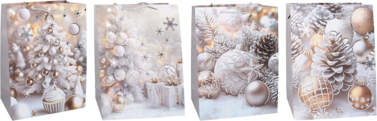 Stiilne jõulude kingikott suuruses S mõõtudega 18 × 24 × 8,5 cm on ideaalne väiksematele kingitustele. Pakub 4 atraktiivset motiivi, vastupidavat teostust ja elegantset välimust kauniks pühadeks pakkimiseks.