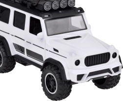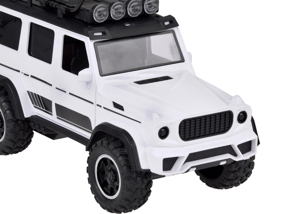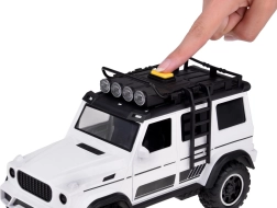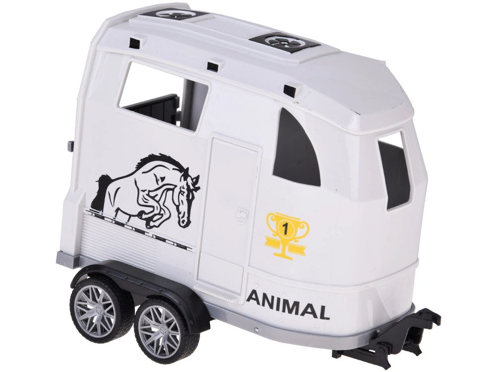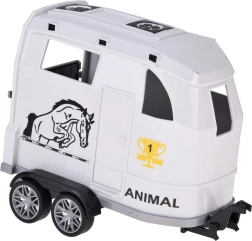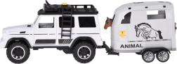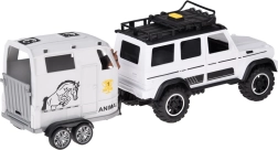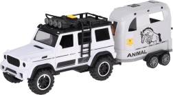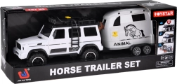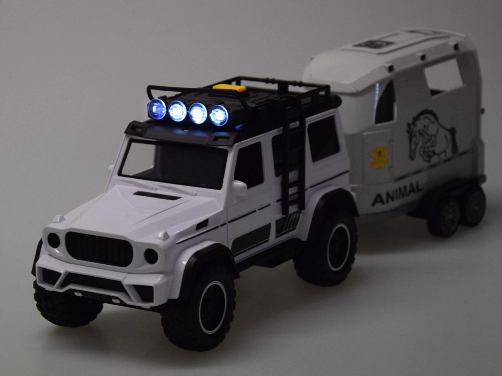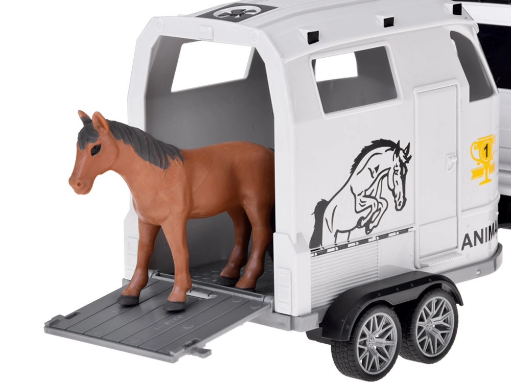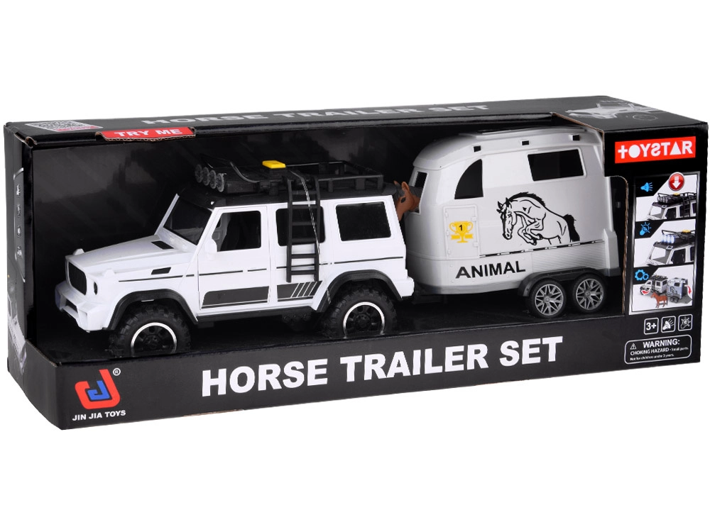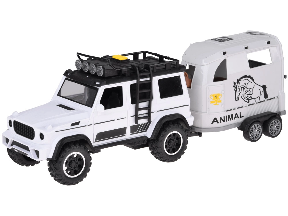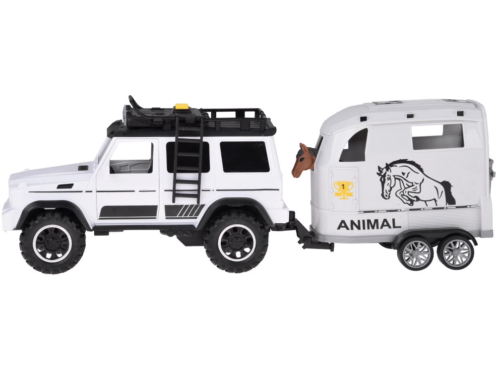 Avasta lõbus komplekt väikestele auto- ja loomaarmastajatele: valge maastikuauto eemaldatava hobuveohaagise ning hobufiguuriga. Sõidukil on avatavad uksed, kummirattad, valgus- ja heliefektid ning haakekonks. Haagisel on allaklapitav tagumine ramp ja sujuvalt veerlevad rattad realistlikuks mänguks.