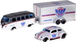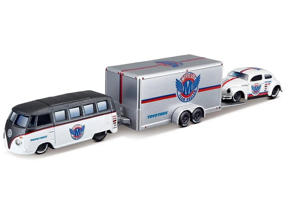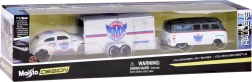 Avastage klassikaliste autode ajatult kaunis disain Maisto täpse teostusega. Elegantse valge–hõbedase viimistlusega komplektis on metallist kered, kerged plastist šassiid ning erinevatel pindadel sujuvaks sõiduks kummist rattad. Beetle mahub mugavalt kaasasolevale haagisele, nii et saate nautida nii autentset transporti kui mõjuvat väljapanekut kollektsioonis.