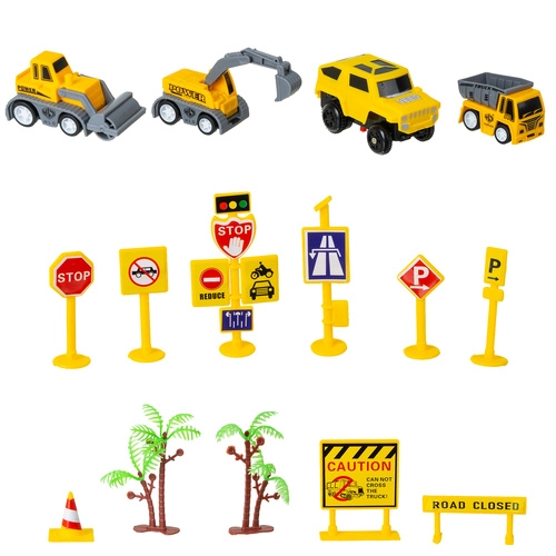 Ekskavaator, teerull ja kallur koos liiklusmärkide, koonuste, tõkete ja palmidega loovad autentse ehitusmaailma tundideks kaasahaaravaks mänguks.