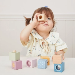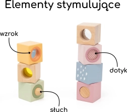 Igal klotsil on ainulaadne element multisensoorsete stiimulite jaoks – peeglist ja kõrinast kuni kompimisstruktuurideni. Tänu käepärastele mõõtudele on neid lihtne haarata, need arendavad silma–käe koordinatsiooni, peenmotoorikat ja toetavad loomingulist vaba mängu.