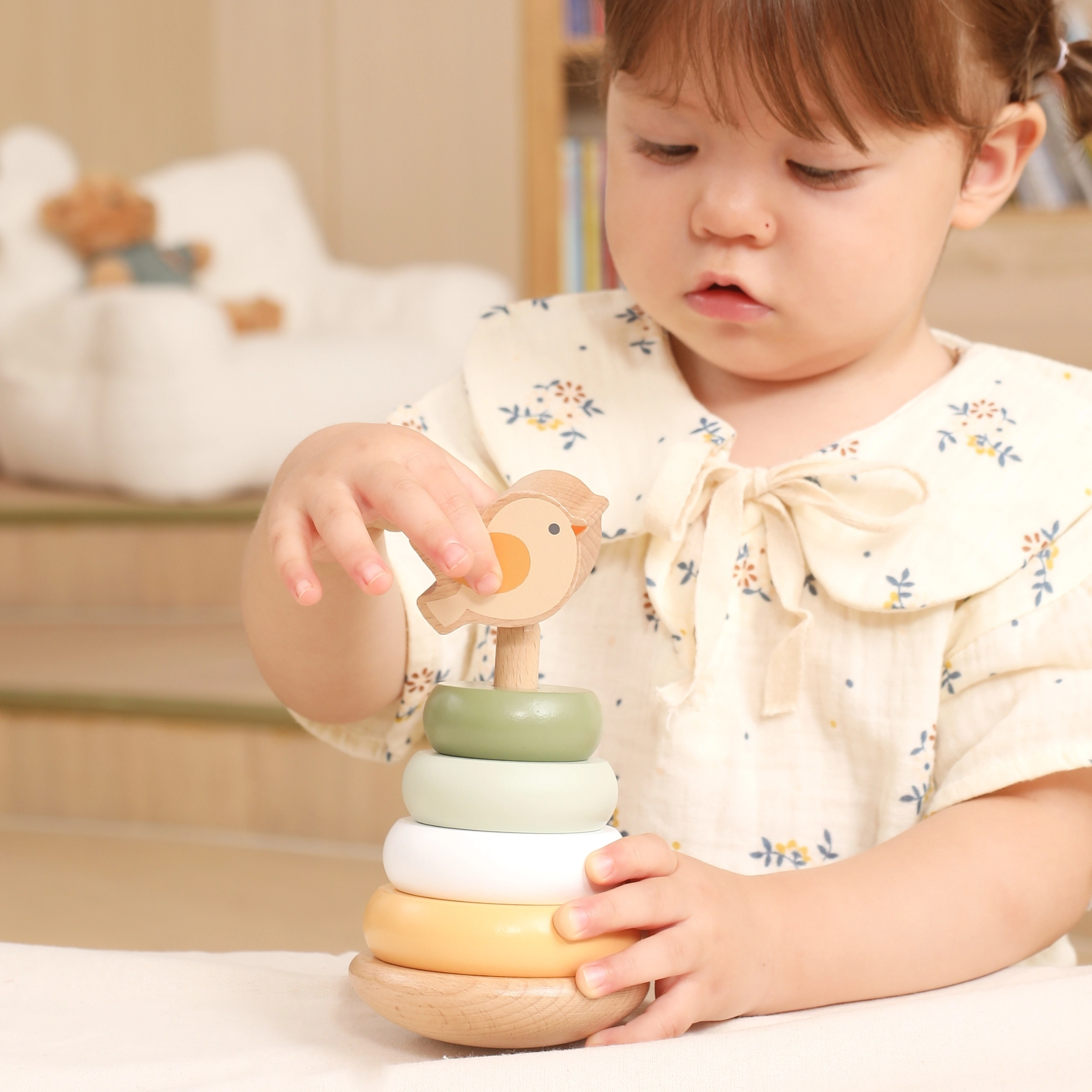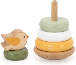 Puidust ladumistorni koos armas linnukesega tipus armastab iga mudilane. Värvilised, siledate servadega rõngad on kergesti haaratavad ja neid saab laduda eri järjekorras, mis toetab värvide ja suuruste eristamist ning probleemilahendust. Stabiilne alus ja meeldivalt ümarad vormid tagavad väikestele kätele ohutu kasutuse.