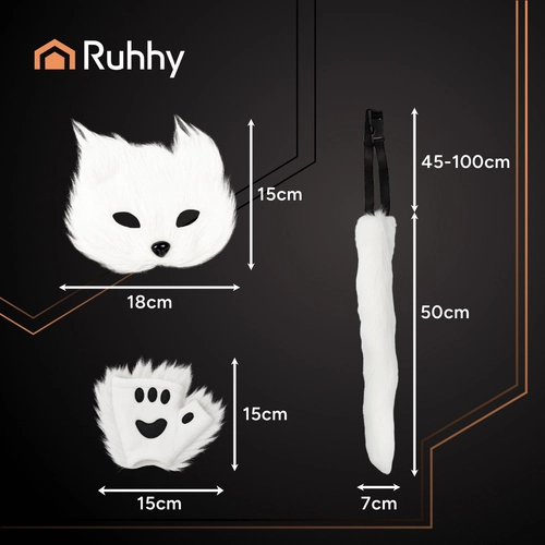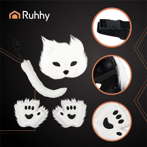 Stiilne ja mänguline valge RUHHY 4‑ühes komplekt on suurepärane valik cosplay‑fännidele, FURRY/Therian kogukonnale ning anime ja alternatiivse esteetika austajatele. Kummipaelaga mask istub mugavalt, pikk reguleeritav saba elastse traadiga on lihtsasti soovitud kujuks painutatav ning käpad/kindad täiendavad kogu muutumise. Ker g konstruktsioon tagab mugavuse ka pikaajalisel kandmisel.