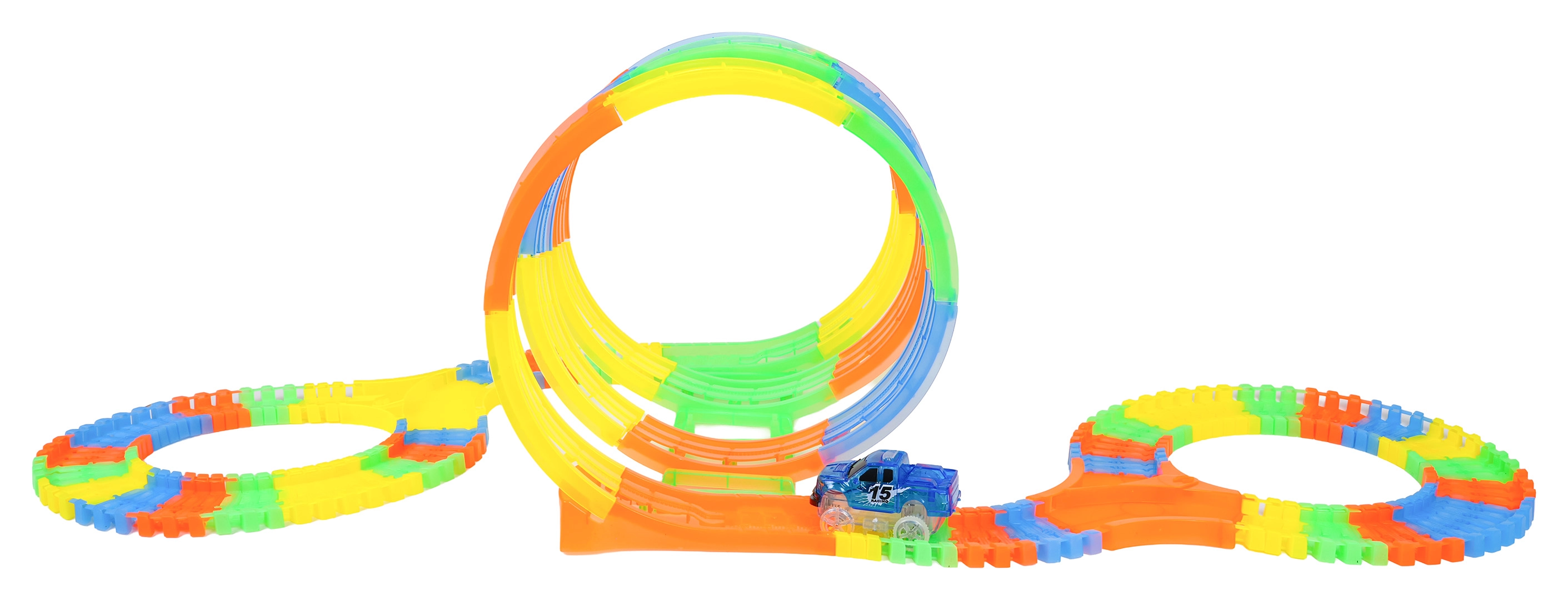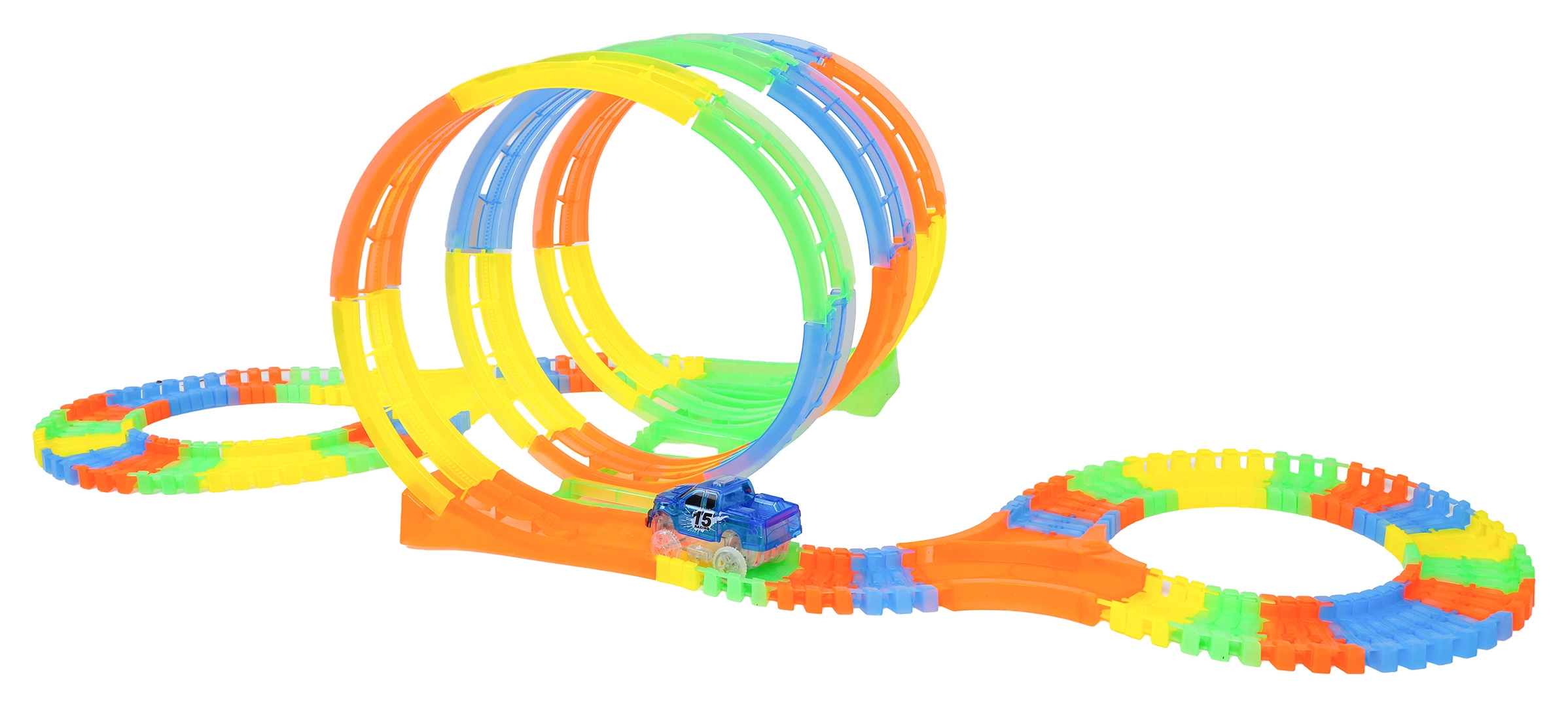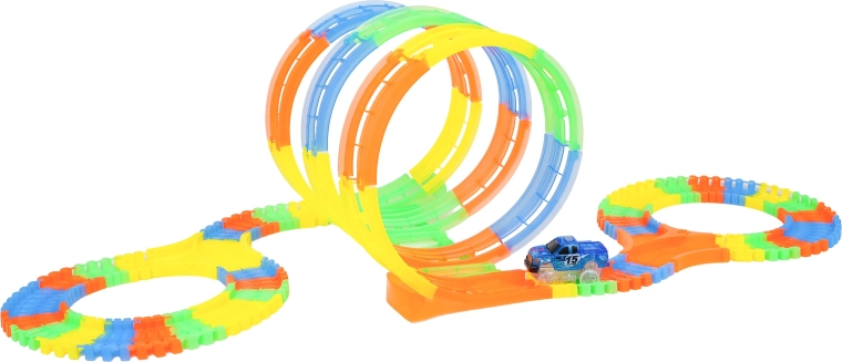 See värviline võidusõidurada pakub lastele loovat ehitamist ja dünaamilist sõitu. Tänu elastsetele, klõpsuga ühendatavatele osadele sünnivad hetkega silmused, kurvid ja sillad, mida saab igal ajal ümber teha – kasvõi sõidu ajal. Rada on fluorestseeruva viimistlusega ning auto LED-valgustus loob pimedas vinge valgusshow.