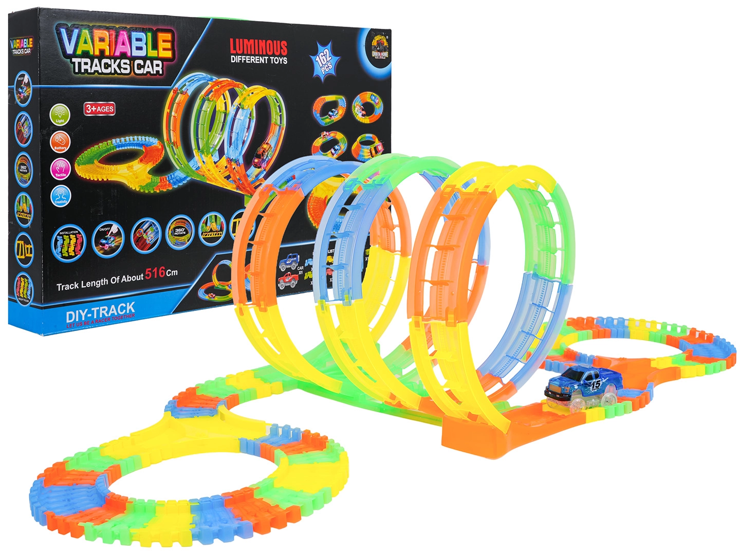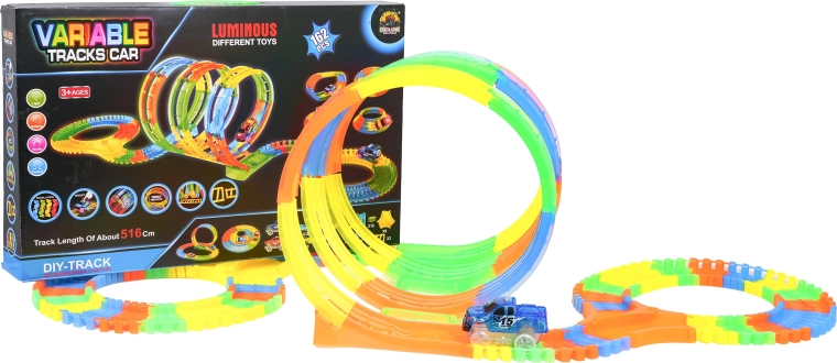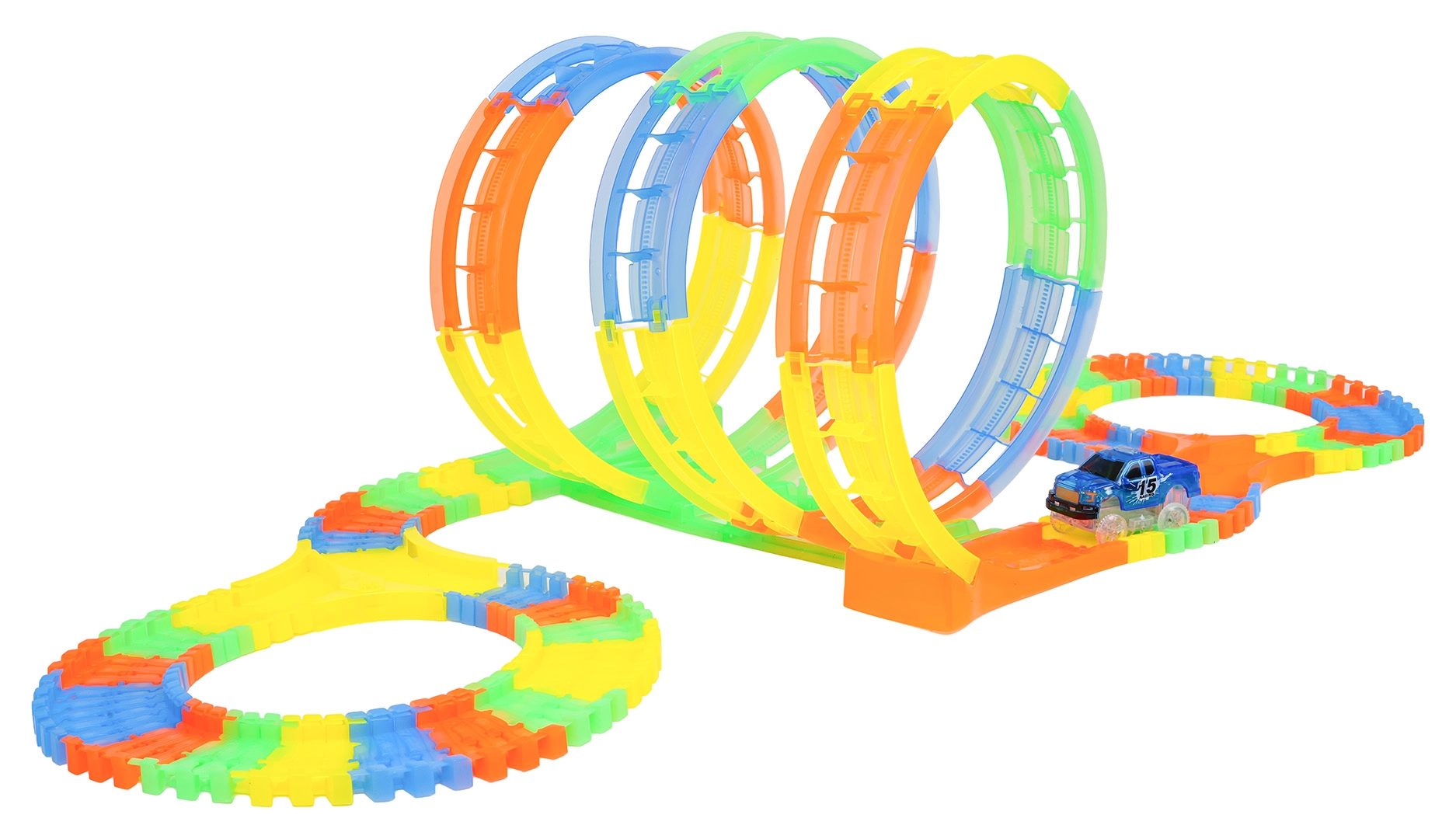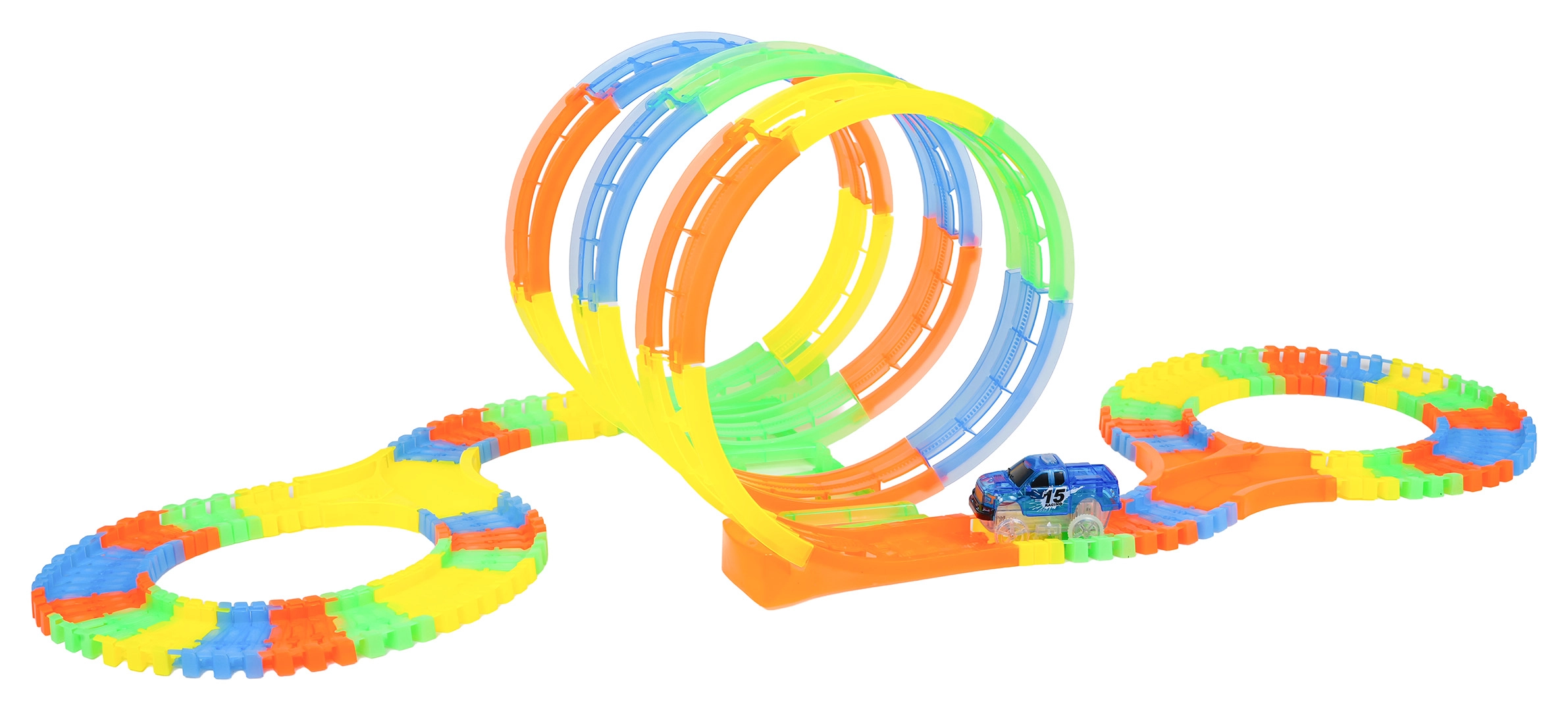 See värviline võidusõidurada pakub lastele loovat ehitamist ja dünaamilist sõitu. Tänu elastsetele, klõpsuga ühendatavatele osadele sünnivad hetkega silmused, kurvid ja sillad, mida saab igal ajal ümber teha – kasvõi sõidu ajal. Rada on fluorestseeruva viimistlusega ning auto LED-valgustus loob pimedas vinge valgusshow.