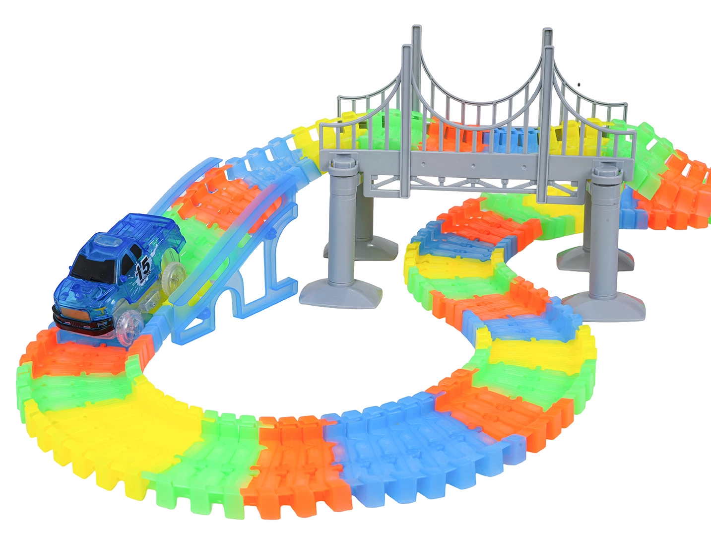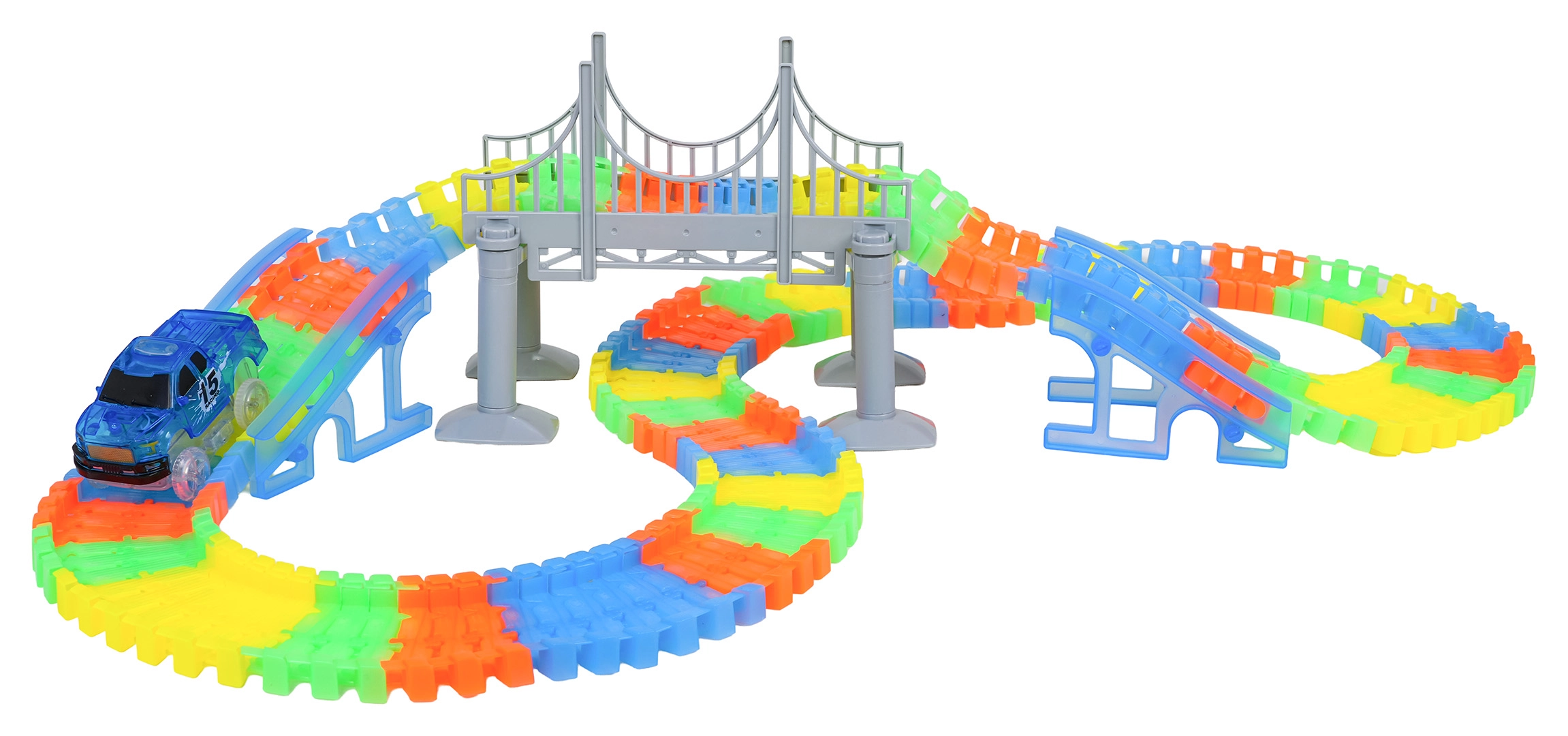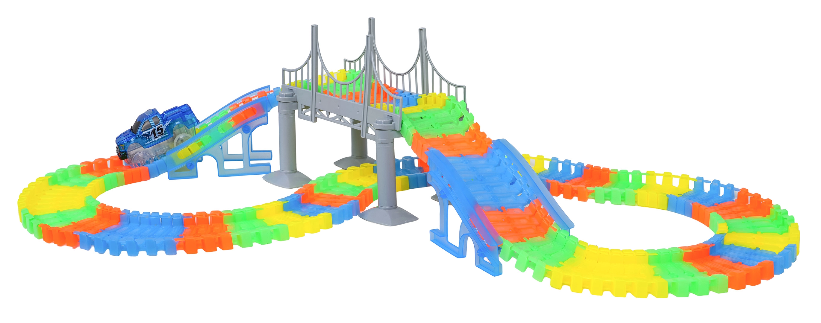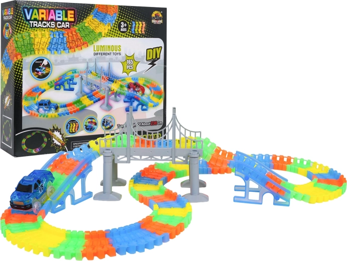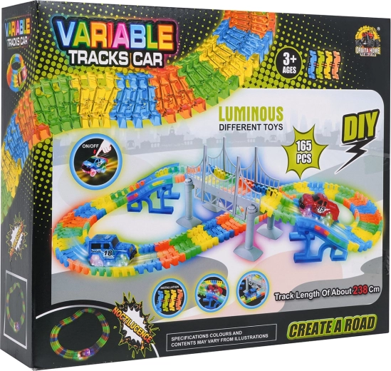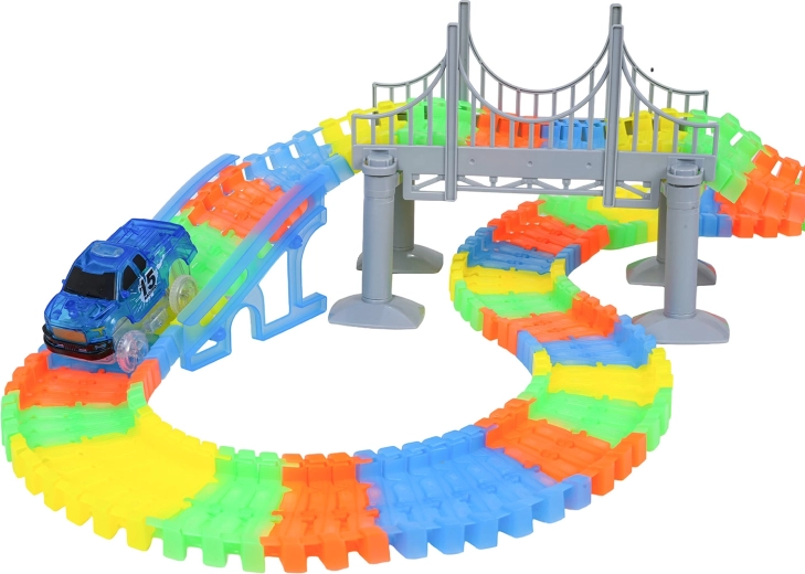 See loominguline võidusõidurada pakub lastele alates 3. eluaastast tunde põnevat mängu. Osad klikitakse hõlpsalt kokku, rada on painutatav ja pööratav, nii et saad luua sildu, rampe ja julgemaid kurve. Rööbaste fluorestseeruv viimistlus paneb toa pimedas helendama.