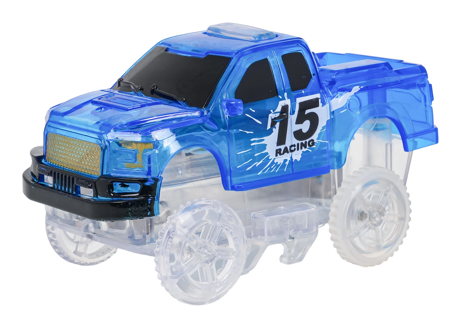 Läbipaistev võidusõiduauto LED-tuledega toob raja ellu. Piisab, kui vajutada katusel asuvat nuppu. Toide 2× AA (ei kuulu komplekti).