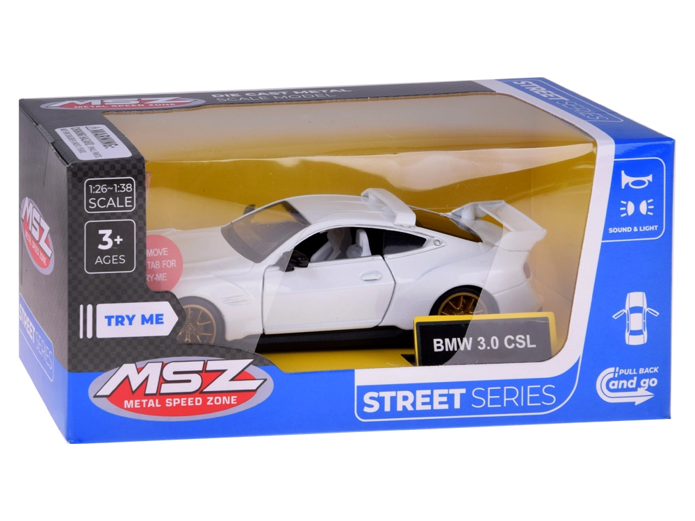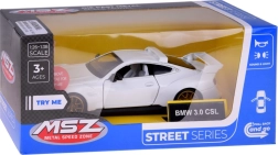 Avasta ikooniline sportauto BMW 3.0 CSL mõõtkavas 1:34 kvaliteetse metallmudelina, millel on avatavad uksed, valgus- ja heliefektid ning tagasikerimise (pull-back) mehhanism. Realistlikud keredetailid ja interjöör, kummirattad sujuvaks sõiduks ning atraktiivne disain teevad sellest suurepärase mänguasja ja kollektsionääri lemmiku.