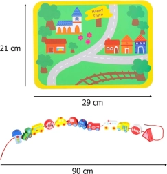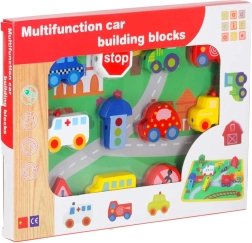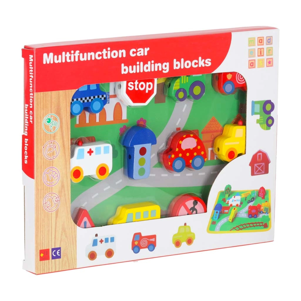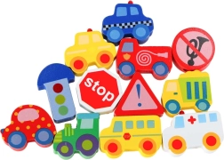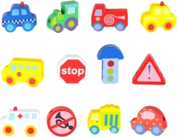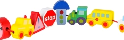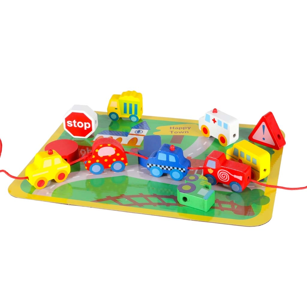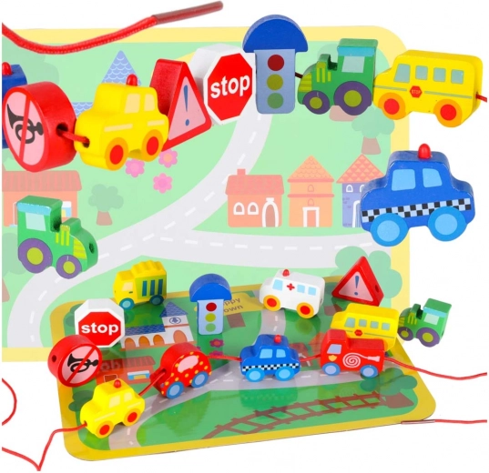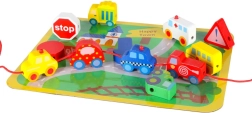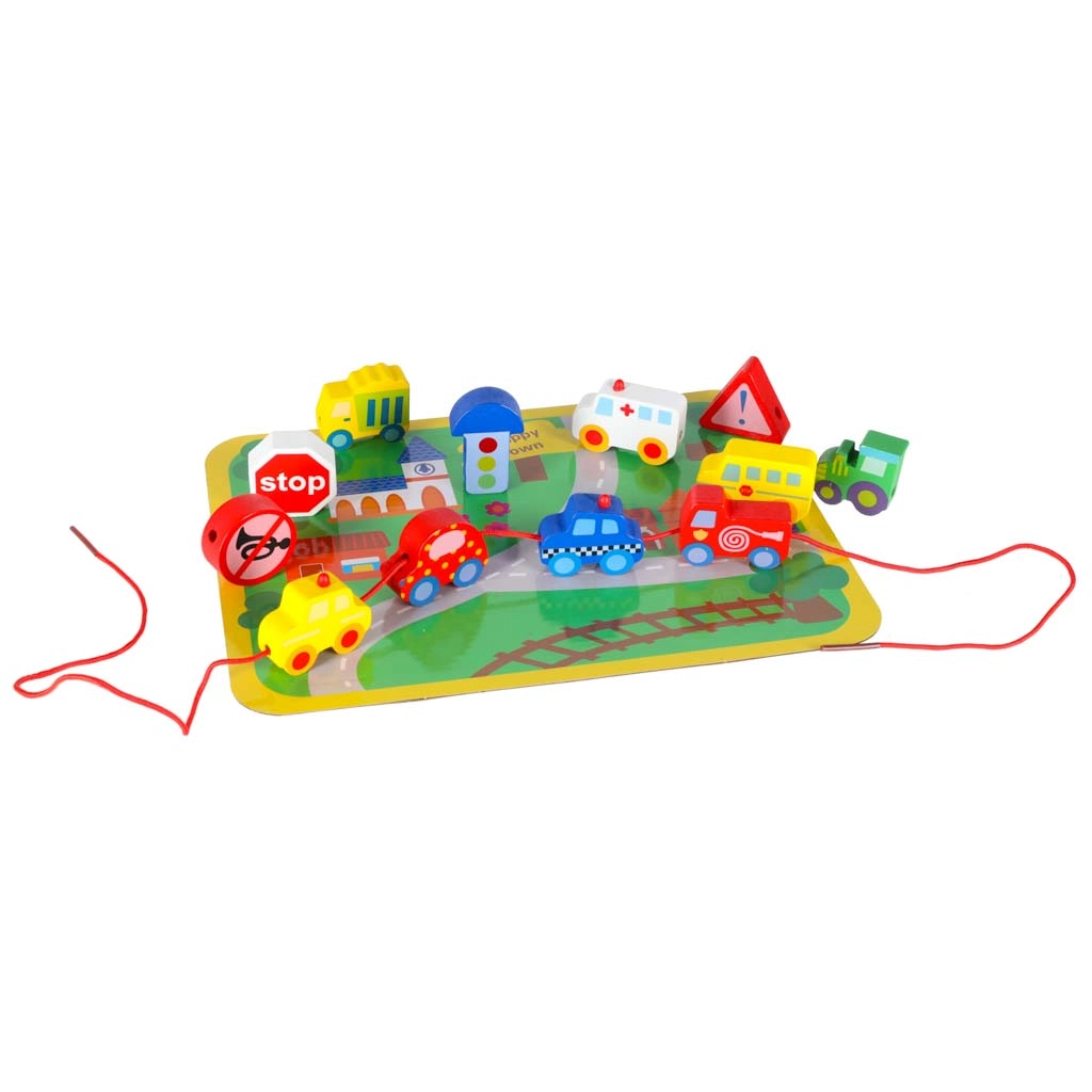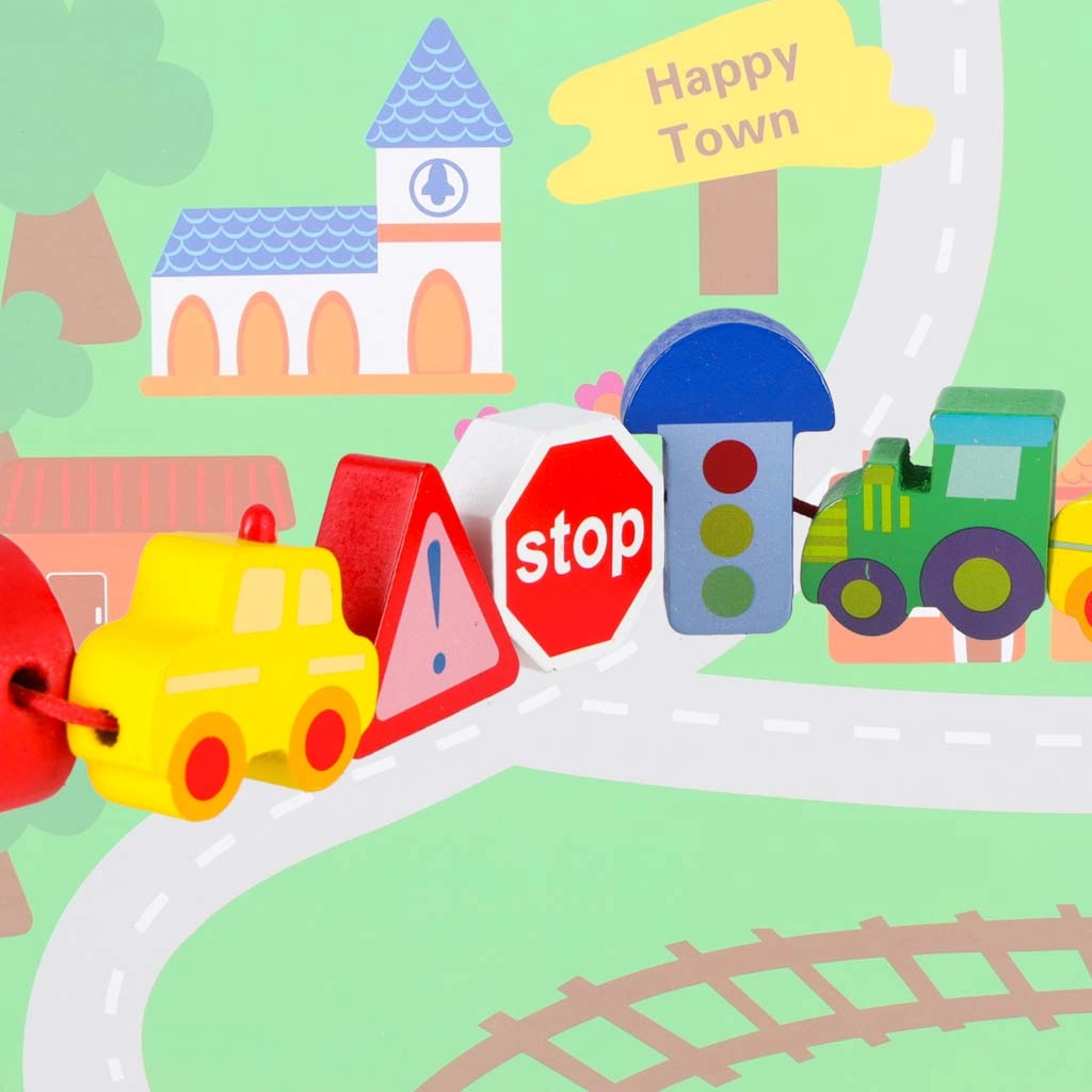See loovkomplekt ühendab puidust klotside nöörile lükkimise vaba mänguga „väikelinna” alusel. Lapsed harjutavad haaret, liigutuste täpsust ja kannatlikkust, samal ajal tutvudes autode, kiirabi, bussi, politsei ning liiklusmärkidega. Detailid on siledalt viimistletud, mõnusad katsuda ja ohutute värvidega.