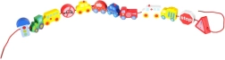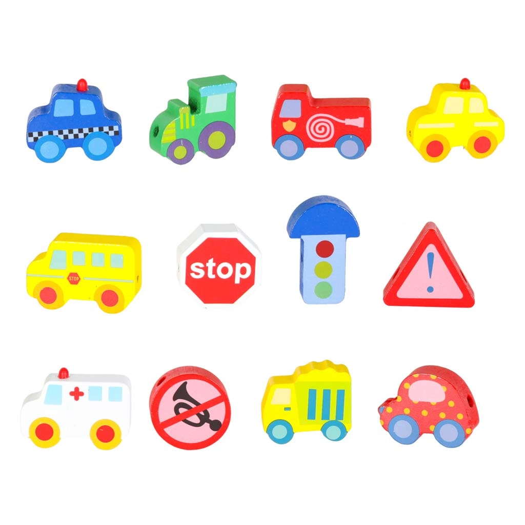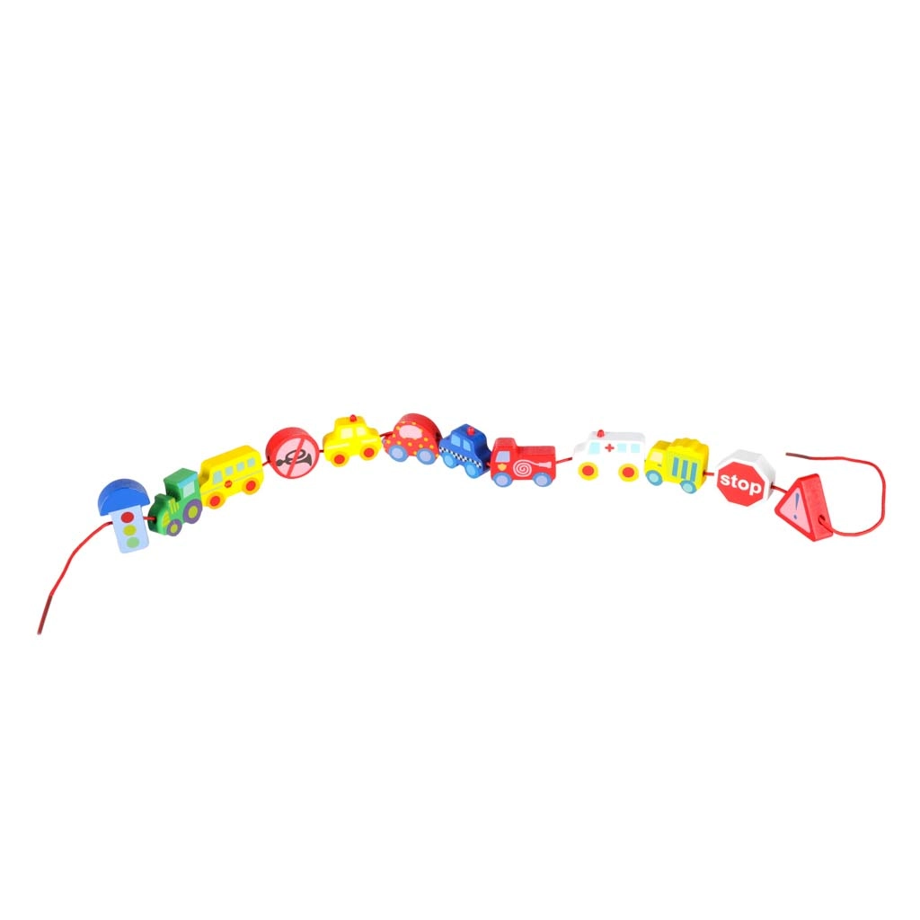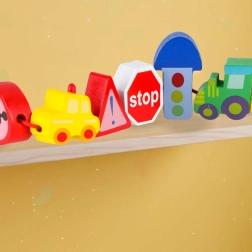 Massiivsed, siledalt viimistletud klotsid sõidukite ja märkide kujul on kergesti haaratavad ning läbivate avade tõttu mugavalt nöörile lükatavad.