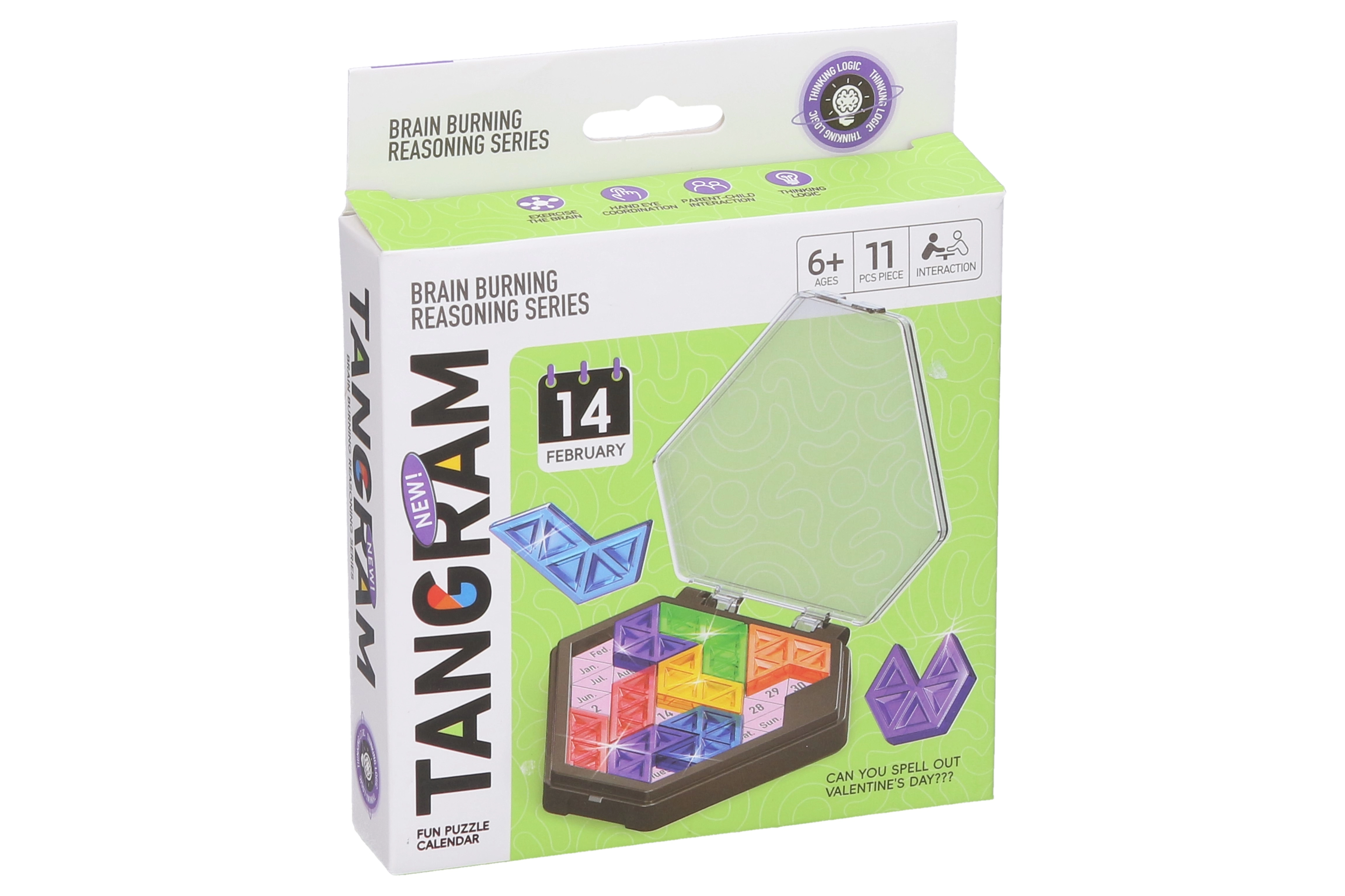 Avasta nutikas ja lõbus viis loogika ja kujutlusvõime treenimiseks selle tangrami mõistatusega, mille läbimõõt on 10 cm. Kaasas on šabloonid erinevate kujundite ning ka konkreetsete kuupäevade (emadepäev, sõbrapäev jm) kokkupanekuks, kus eesmärk on paigutada tükid nii, et nähtavale jääks ainult kindel kuupäev ja nädalapäev. Saadaval 2 variandis – must ja valge.