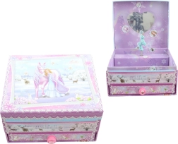 Võluv muusikaline ehtelaegas ükssarviku motiiviga rõõmustab kõiki väikeste aardete austajaid. Pärast võtme kerimist hakkab kaane avamisel kuju tantsima ja kõlab meeldiv meloodia. Sees on peegel, mis on mugav ehete proovimiseks, ning all väljatõmmatav sahtlike sõrmuste, käevõrude ja muude pisiasjade jaoks. Kompaktsed mõõtmed u 16 × 14 × 9 cm ja õrnad muinasjutulised motiivid teevad sellest ehtelaekast kauni lisa lastetuppa ja vahva kingiidee.