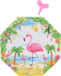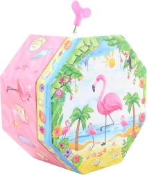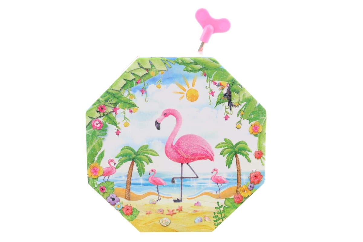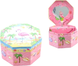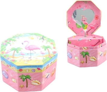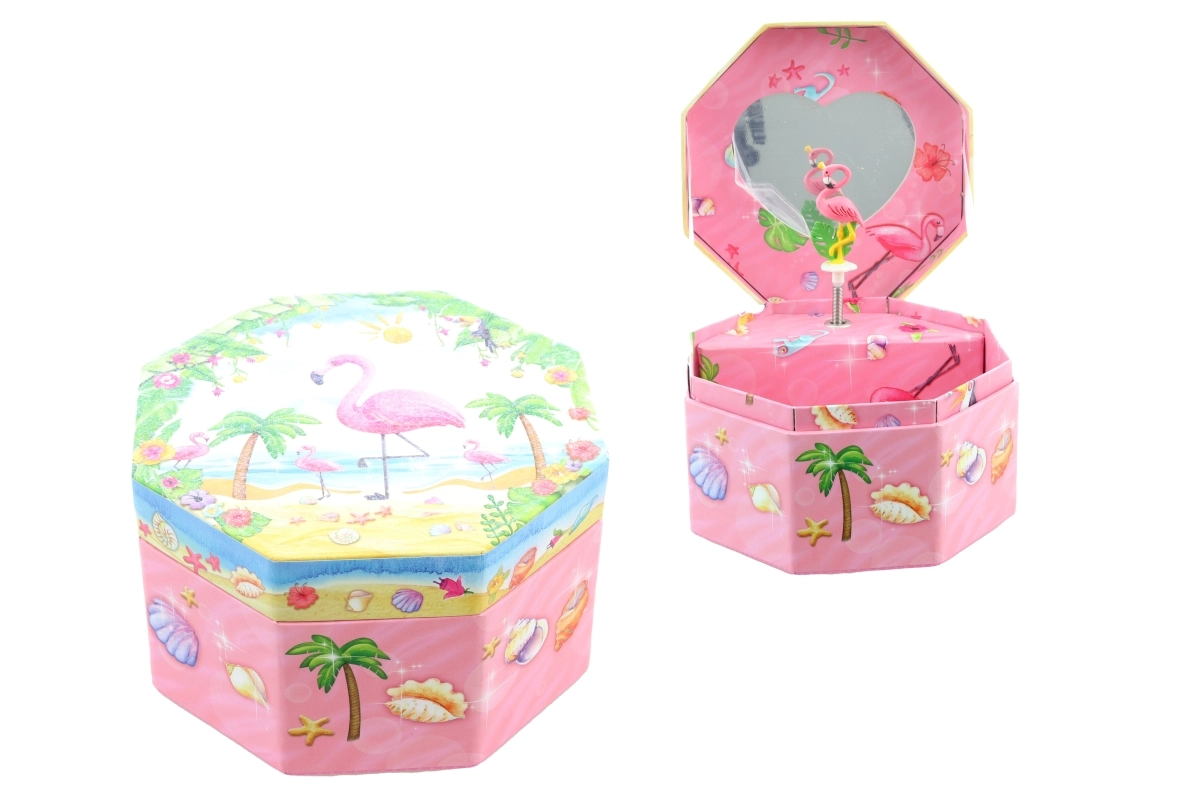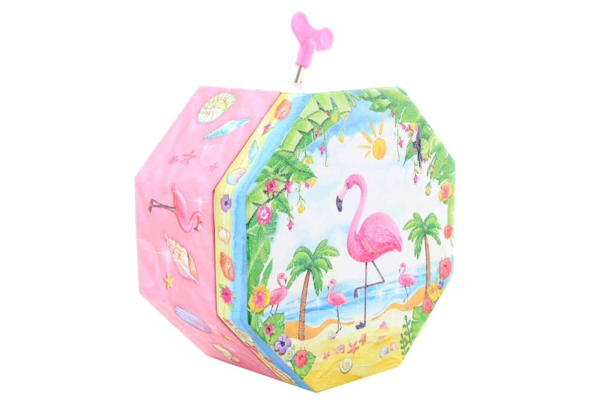 See võluv roosa muusikaline ehtekarp on kaheksanurkse kujuga ning troopilise flamingo-, palmi- ja karbimustriga. Avamisel ilmub tantsiv flamingo südamekujulise peegli ees, mis hakkab võtmeke keeramisel pöörlema ja saadab ehete hoiustamist meeldiva meloodiaga.