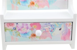 Võluv laste ehetekarp koos südamekujulise kallutatava peegliga ja ükssarviku motiiviga on ideaalne väikeste aarete hoiustamiseks. Pakub praktilist sahtlikest, stabiilset puidust teostust ja ohutut kasutamist alates 3. eluaastast.