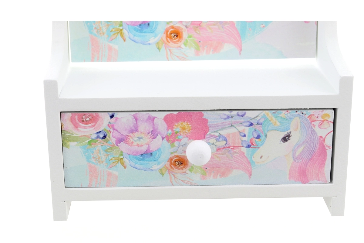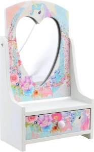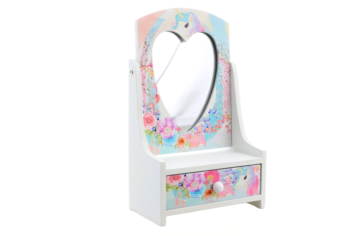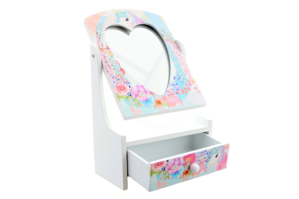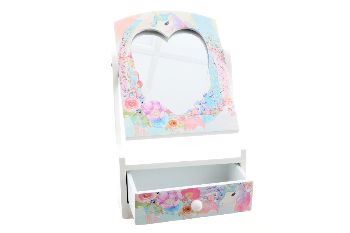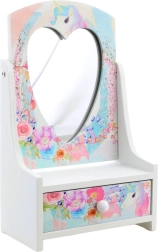 Armas puidust ehetekarp kallutatava südamepeegliga aitab lastel hoida oma aardeid korrastatult ühes kohas. Õrnad pastelsed lille- ja ükssarvikumotiivid teevad sellest kauni lastetoa kaunistuse ja praktilise abilise igapäevaseks kammimiseks ja mänguks.
