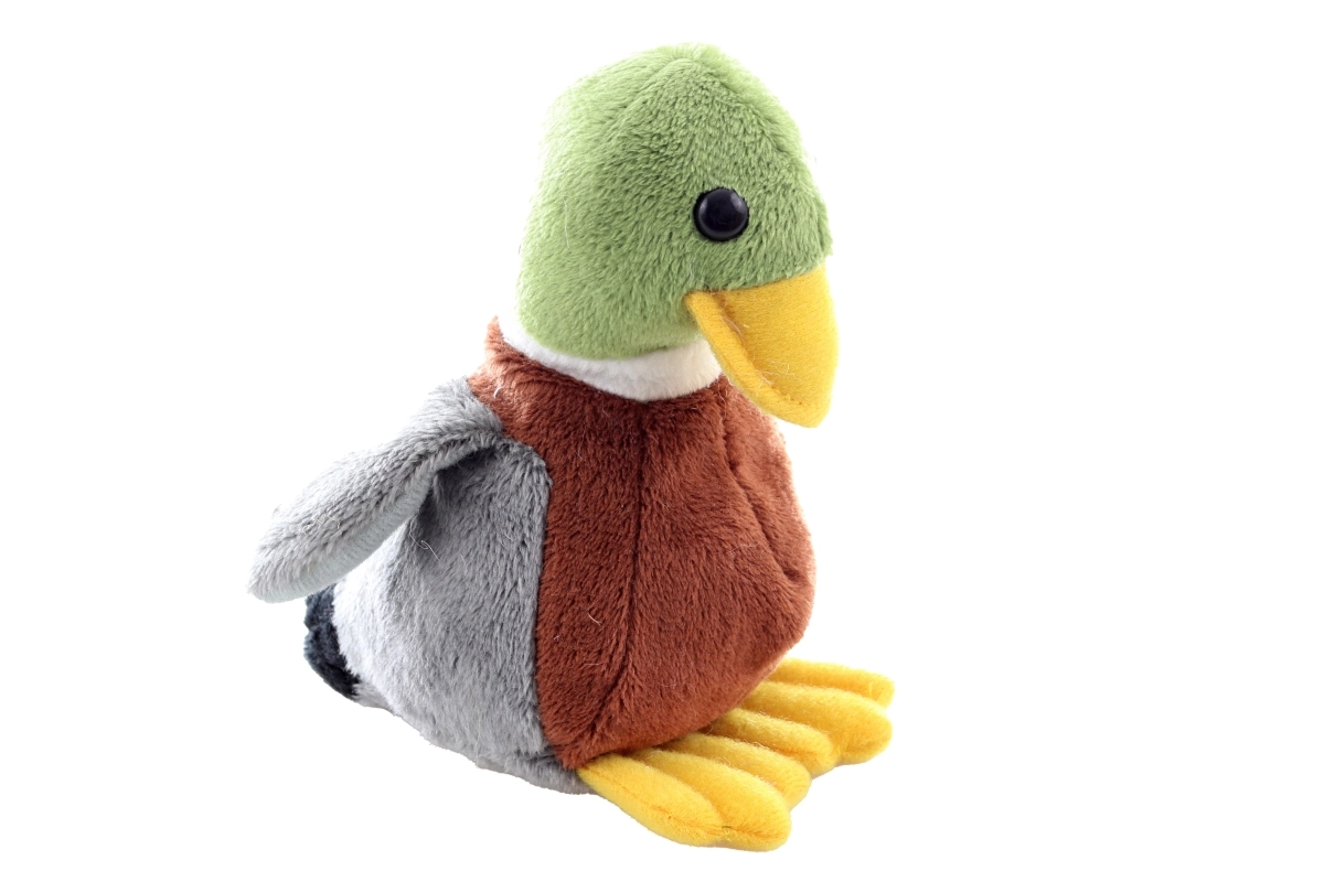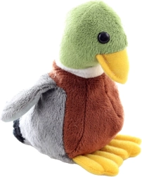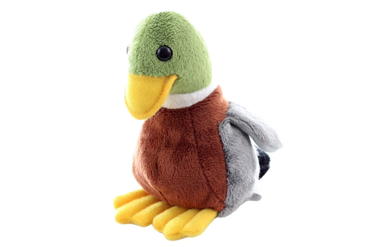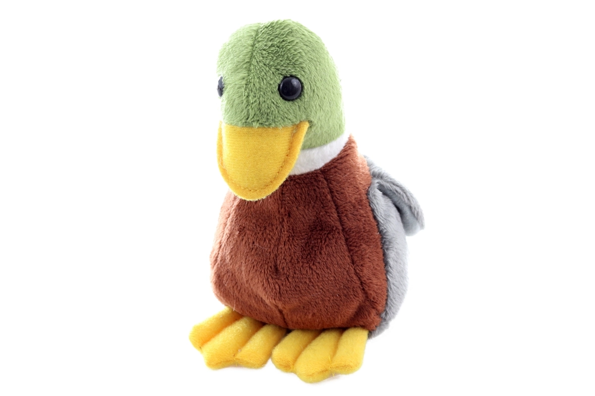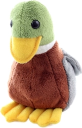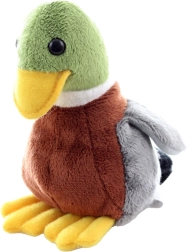 See detailirohke plüüskark õrna ja siidise pinnaga ning realistliku värvilahendusega (roheline pea, kollane nokk ja jalad, pruun keha, hallid tiivad) rõõmustab iga väikest loomakesesõpra. Tänu täites olevatele kuulikestele püsib see stabiilne ja istub paremini riiulil või voodis.