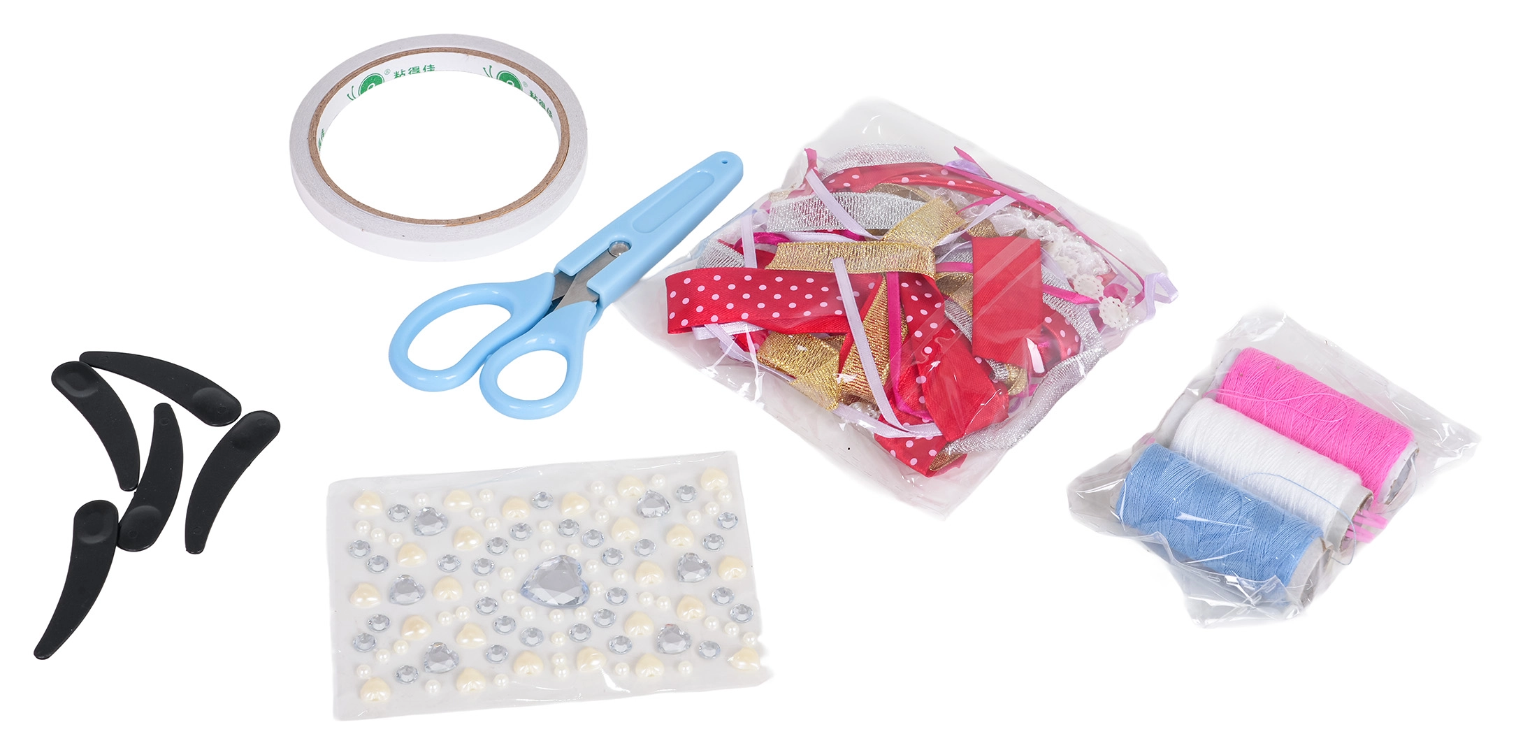 - 5× mannekeen, nukk, käärid, pliiats/kriit, teip, 3× niit, kangale mõeldud aplikatsioonid, värvilised paelad, 4× kotike kangaga ja kartongist lõikega, kotike litrikangaga, nõelad (plastist ja metallist)