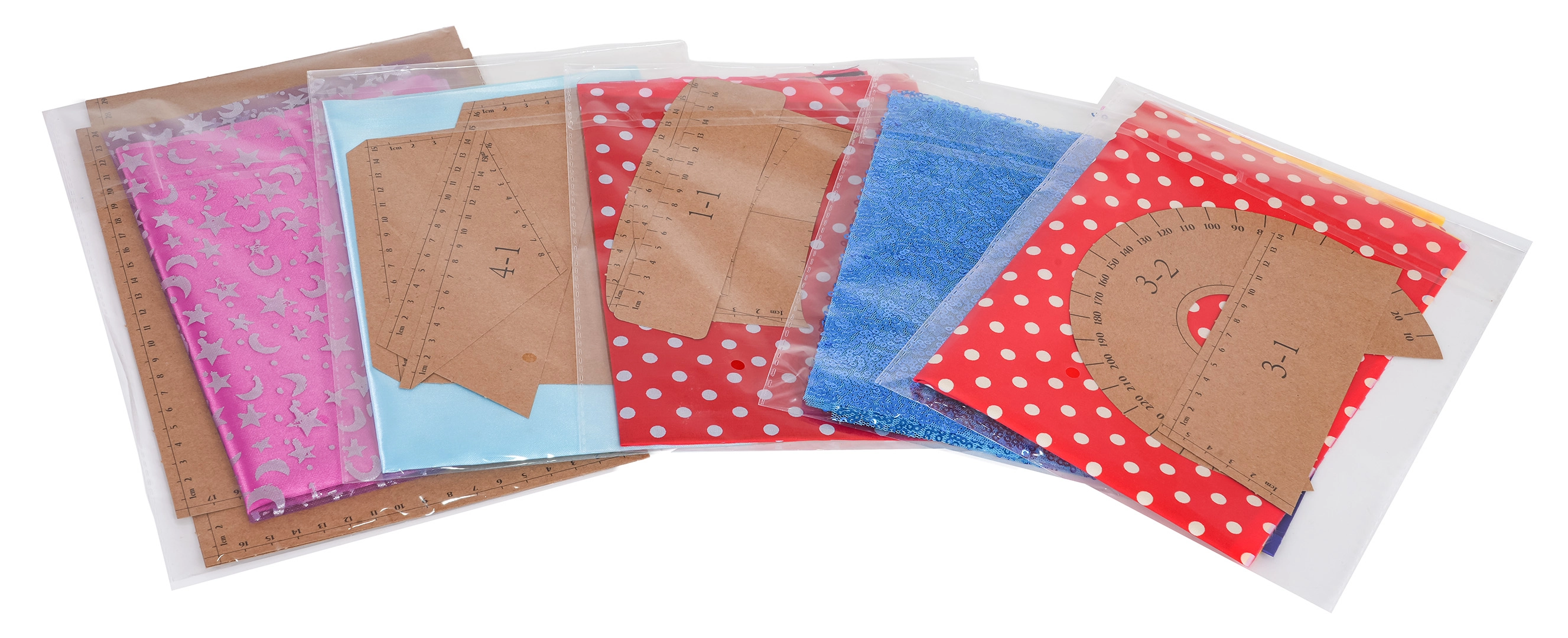 Komplektis on kotikesed kangaste ja kartongist lõigetega, mis hõlbustavad täpset lõikamist ja kiiret liikumist kavandist õmbluseni.