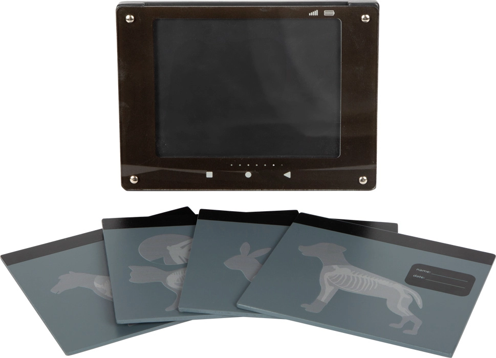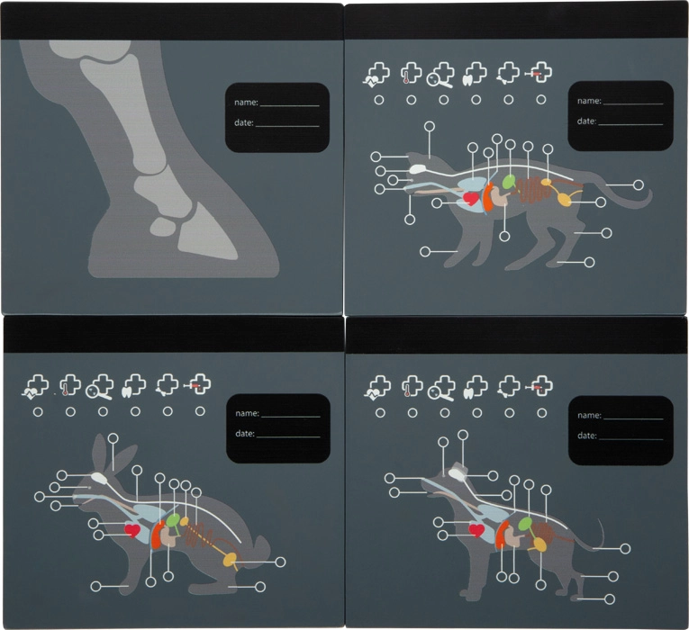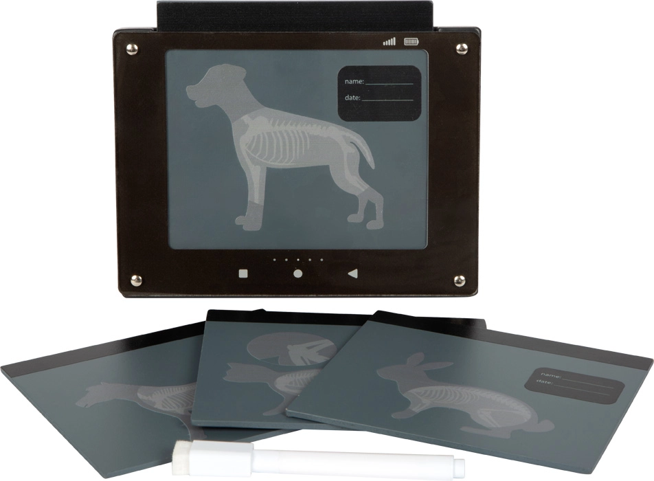 Interaktiivne „röntgen” läbipaistvate loomakaartidega (koer, kass, jänes, hobune) toetab kujutlusvõimet ja selgitab keha ehitust mängulisel viisil. Märkmeväli võimaldab kirjutada patsiendi nime ja läbivaatuse kuupäeva.