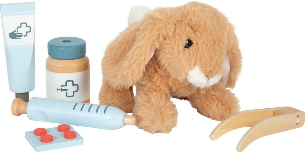 See armas veterinaarkomplekt ühendab pehme plüüsjänku realistlike tööriistadega: stetoskoop, termomeeter, otoskoop, süstal, side ja kaitsekrae. Komplektis on ka „röntgen” tahvel vahetatavate piltidega (koer, kass, jänes, hobune) ning kirjutatavad kaardid märkmete jaoks. Lapsed harjutavad loomade eest hoolitsemist, sõnavara arendamist ja terviseteadlikkust – ning saavad samal ajal palju loovat mängurõõmu.