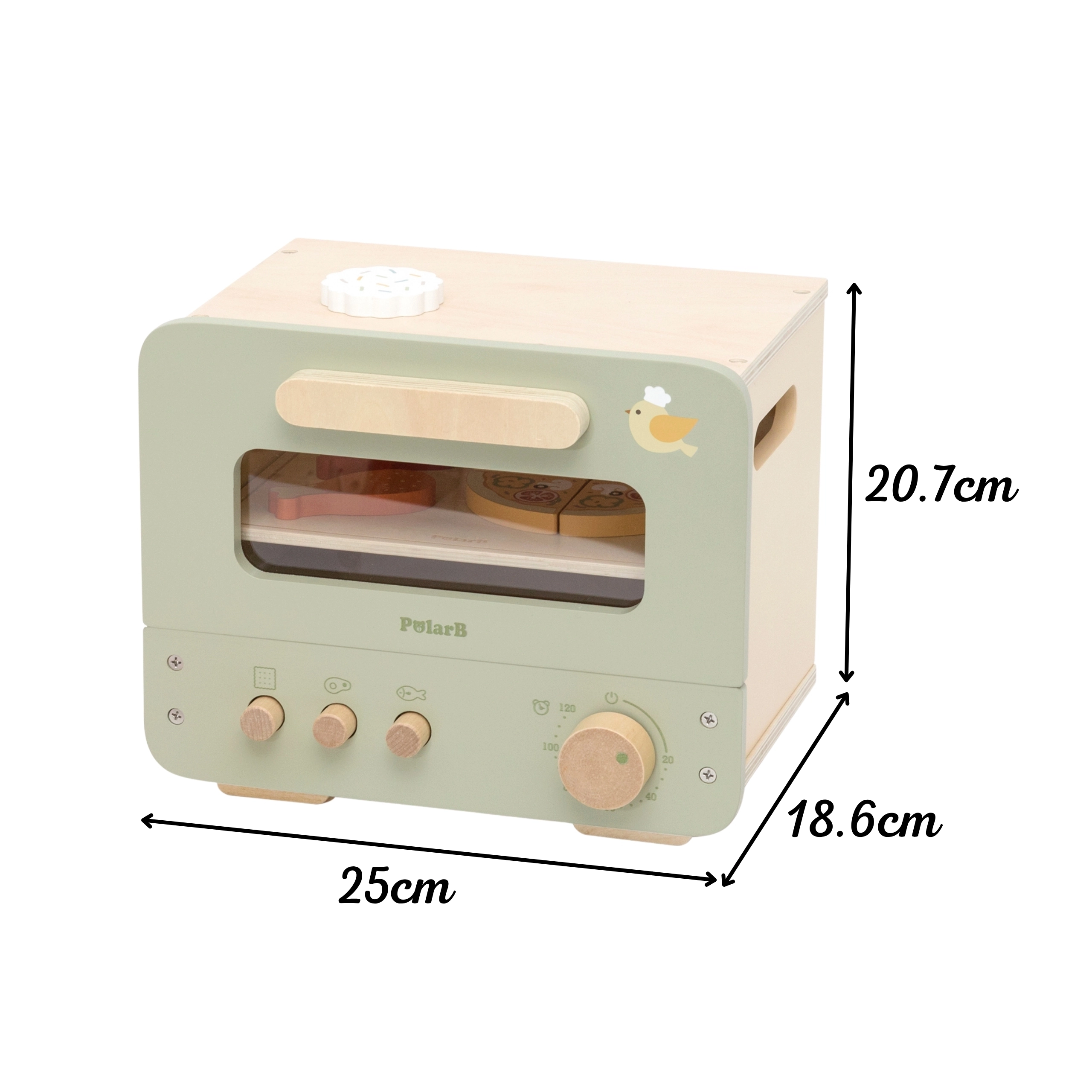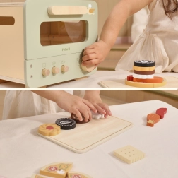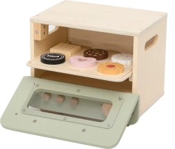 See stiilne lasteahi rohelise–beeži viimistlusega pakub lastele autentset küpsetamiskogemust. Läbipaistev aknake, toimivad nupud ja eemaldatav plekk kutsuvad loovalt serveerima nii magusaid kui ka soolaseid hõrgutisi. Lapsed saavad lõigata ja kokku panna mini pitsat, küpsetada küpsiseid ning harjutada osavust ja suhtlemist rollimängus.