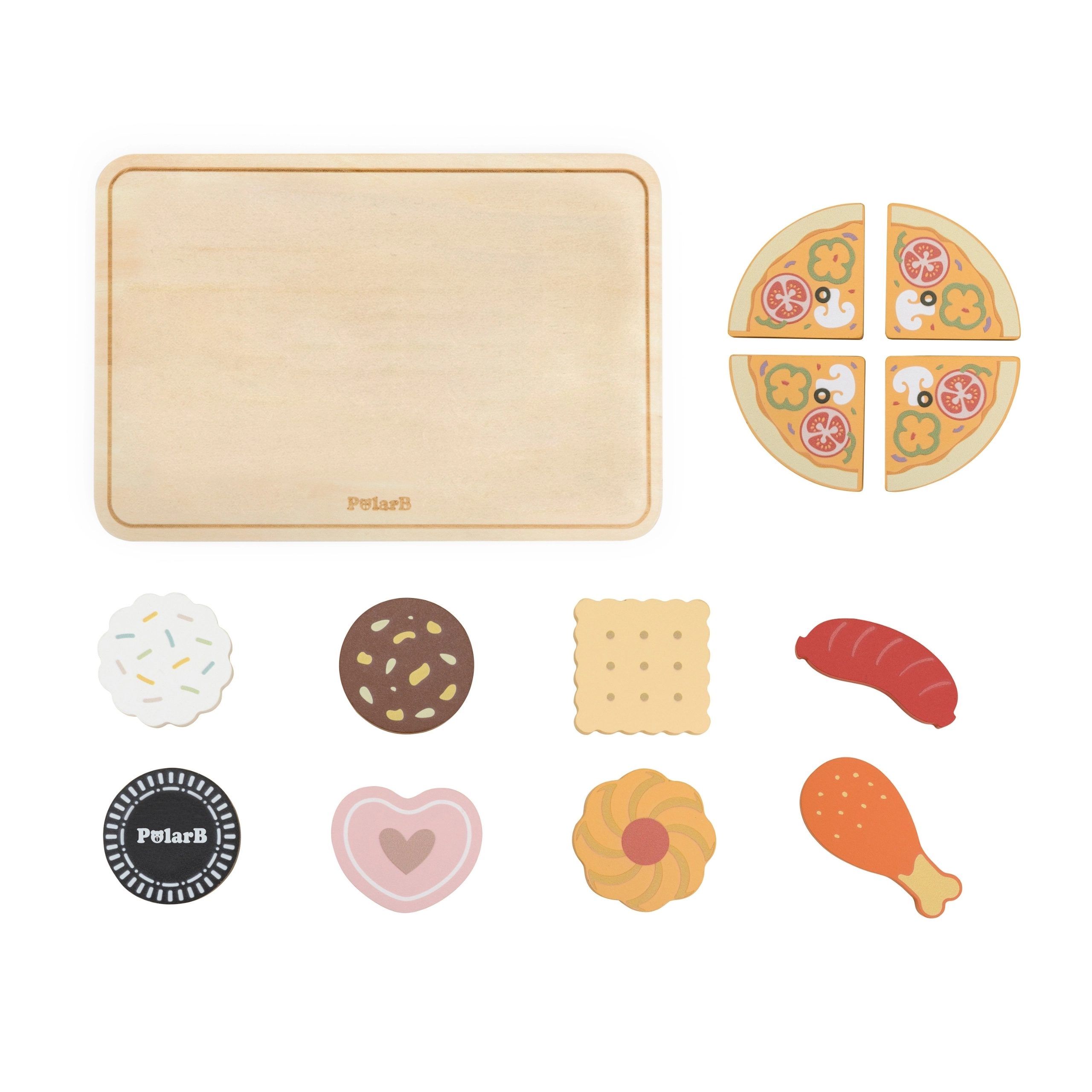 Komplektis on küpsetusplekk, 6 eri kujuga küpsist, 4 tükist mini pitsa, viiner ja kanakoib – kõik serveerimiseks valmis.