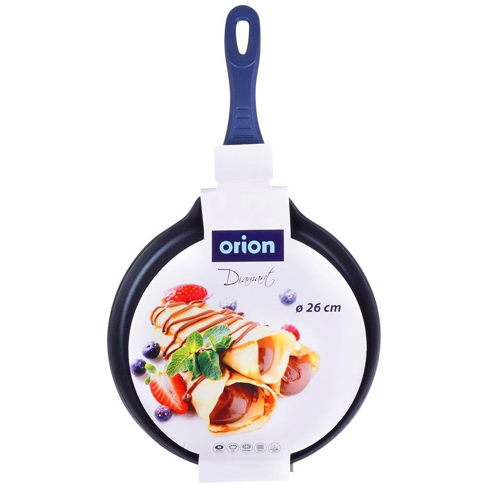 Avastage 26 cm läbimõõduga pannkookide pann teemantkattega mittenakkuva pinnaga, mis on valmistatud vastupidavast valualumiiniumist. Tagab kiire ja ühtlase soojusjaotuse, on PFOA ja PTFE vaba ning tänu ergonoomilisele libisemiskindla silikooniga käepidemele on mugav kasutada. Sobib kõigile pliiditüüpidele, sh induktsioonile, ja on nõudepesumasinas pestav.
