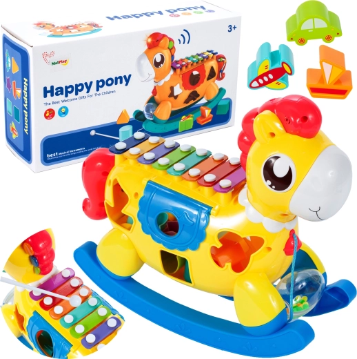 See armas kiikhobune pakub lastele palju tegevusi ühes mänguasjas. Integreeritud sorteerija aitab harjutada peenmotoorikat ja loogilist mõtlemist, samal ajal kui taldrikud pakuvad esimesi muusikalisi kogemusi. Saba helmeste pööramine tekitab ergutava krõbiseva heli, mis ärgitab uudishimu ja sensoorset tajumist.