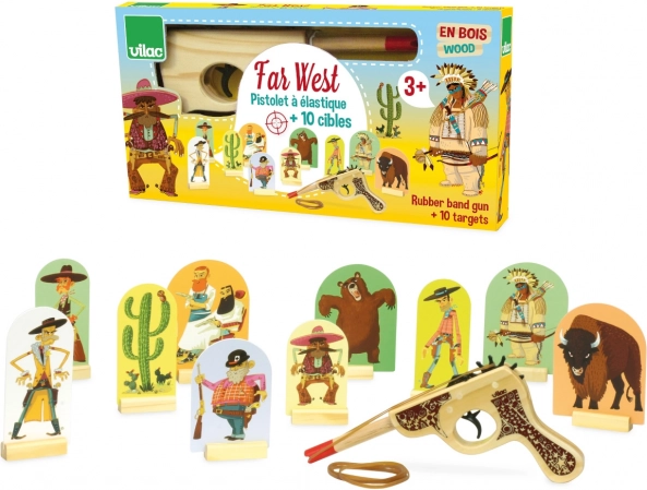 Koge Metsiku Lääne atmosfääri VILACi puidust märklaudadega püstoliga. Mäng sobib lastele alates 3. eluaastast ning aitab harjutada täpsust, keskendumist ja peenmotoorikat. Piisab, kui tõmmata kummipael pingule, seada märklaudad paika ja hakata sihtima – lõbu kogu perele.