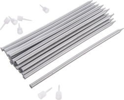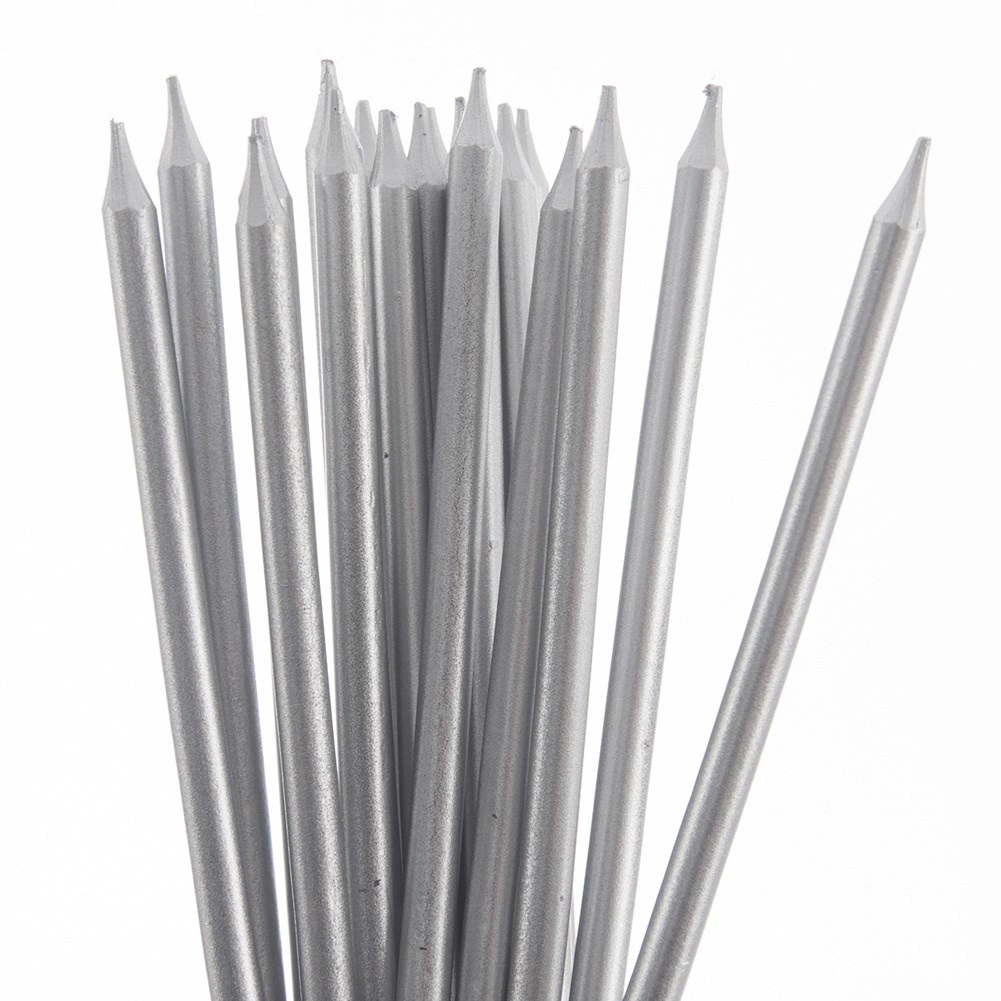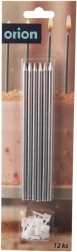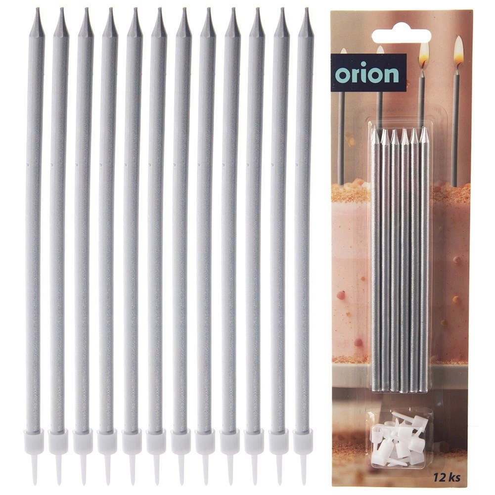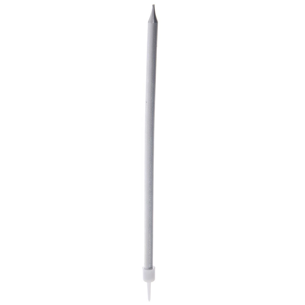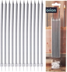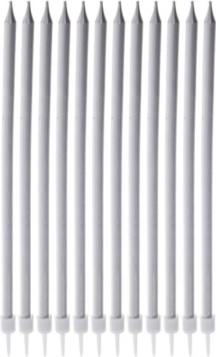 Elegantne komplekt 12 pikkast tordiküünlast metallik-hõbedases värvitoonis, kõrgus 14,5 cm, pidulike tortide ja magustoitude kaunistamiseks. Komplektis on valged plastalused stabiilseks kinnituseks. Värske disain ja efektne kõrgus annavad igale peole erilise ilme. Universaalne hõbedane värv sobib iga tordiga.