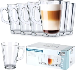 Elegantne kuue latteklaasi komplekt, mahutavus 255 ml, mugava sangaga. Valmistatud vastupidavast paksuseinalisest klaasist, sobib kuumadele ja külmadele jookidele, nõudepesumasinas pestav ja kasutatav mikrolaineahjus. Ideaalne kohvile, teele, veele ja limonaadile – suurepärane valik nii koju kui ka toitlustusse.