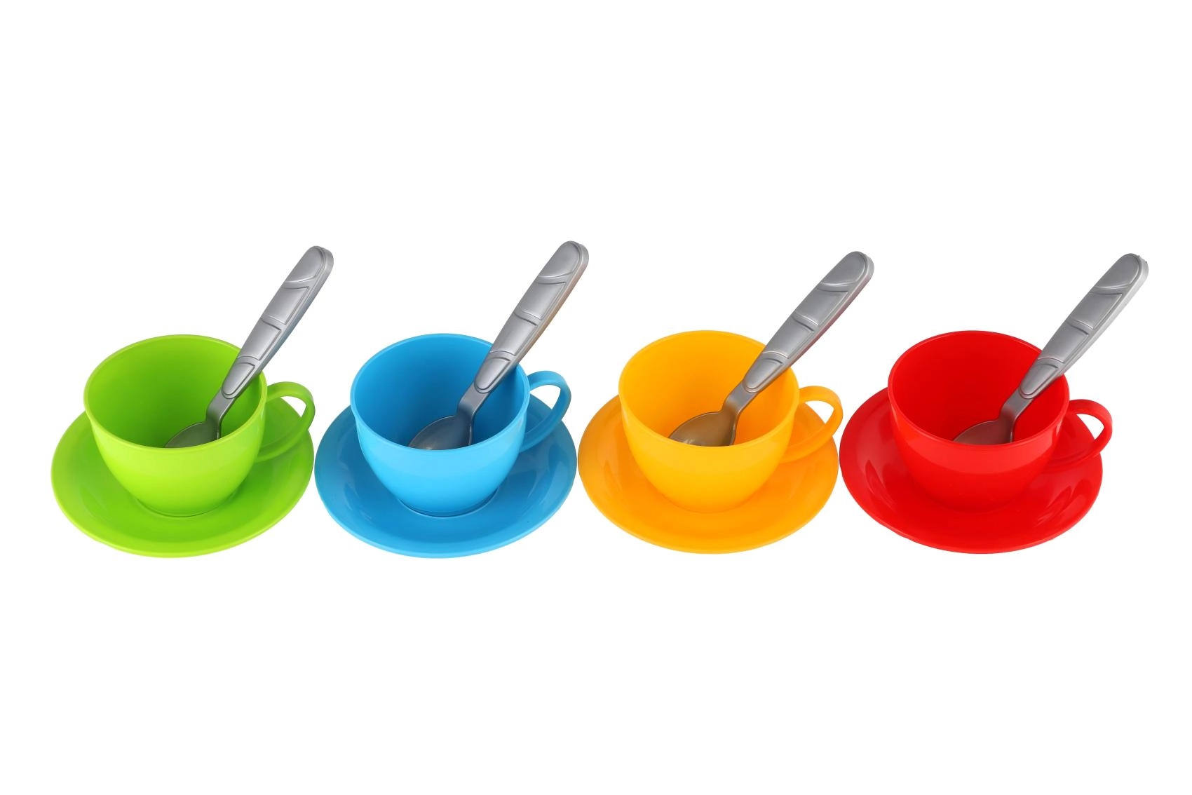 - Teekann, 4 tassi, 4 alustaldrikut, 4 lusikat (värvikombinatsioon)