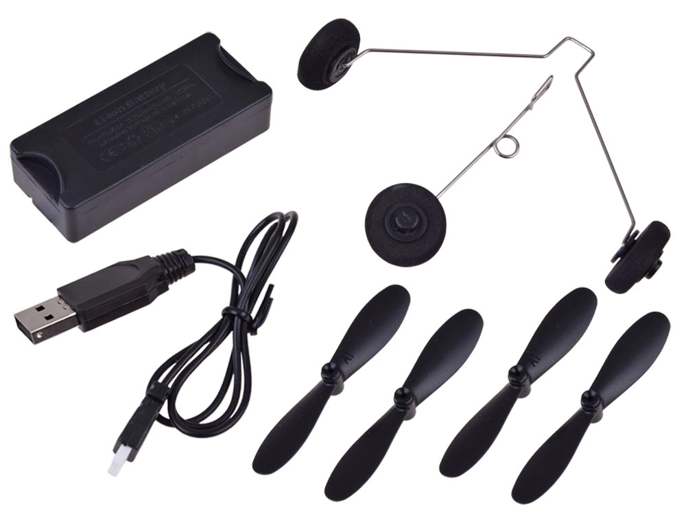 Komplektis on varupropellerid, telik, USB-kaabel ja 2,4 GHz RC-pult. Lihtsalt pane kokku, lae ära ja lenda.