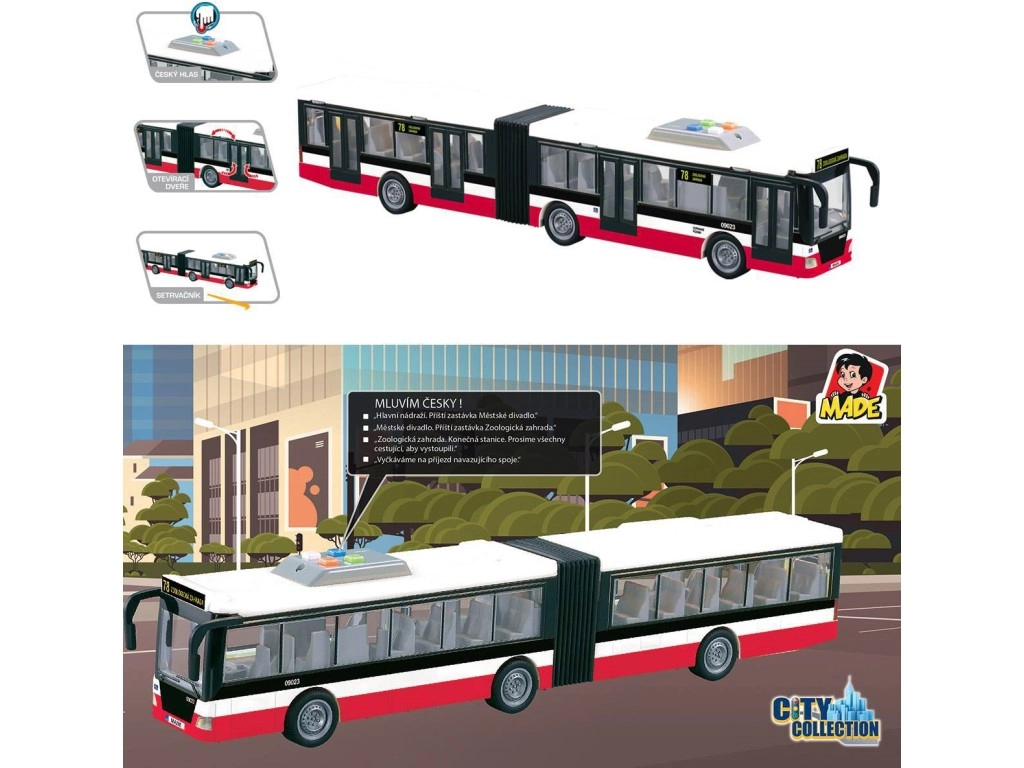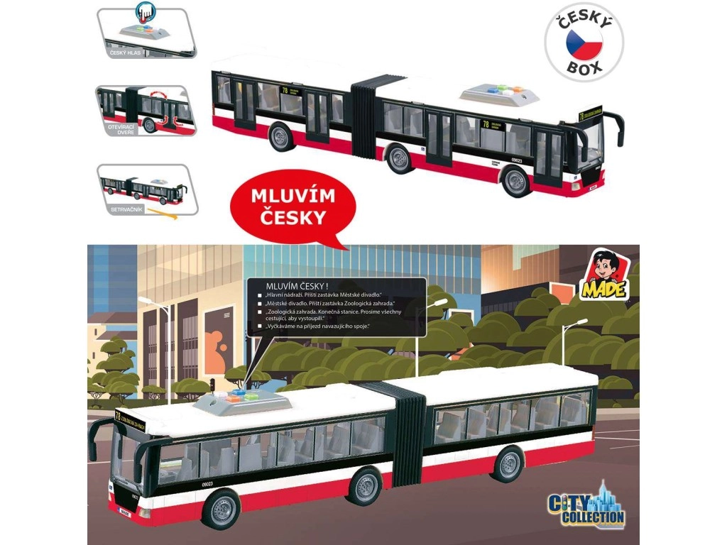 See detailselt viimistletud liigendbuss pakub lastele realistlikku linnatranspordi kogemust. Tänu hõõrdejõu veole hakkab see kergesti liikuma ning valguselemendid koos tšehhikeelsete peatuseteadustustega võimendavad mängu ja arendavad kujutlusvõimet.