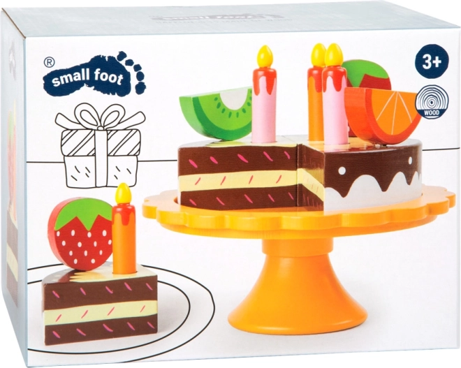 Small Footi puidust sünnipäevane puuviljatort sobib suurepäraselt iga lapse peole. Interaktiivne mänguasi võimaldab lastel mängida üksikute puuviljatükkidega, mis on kinnitatud varrastega ja mida saab lihtsasti ümber paigutada. Küünlad ja kaunistused annavad tordile autentsed ilme ning lapsed saavad mängida päris sünnipäevapidu.