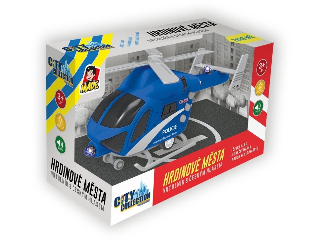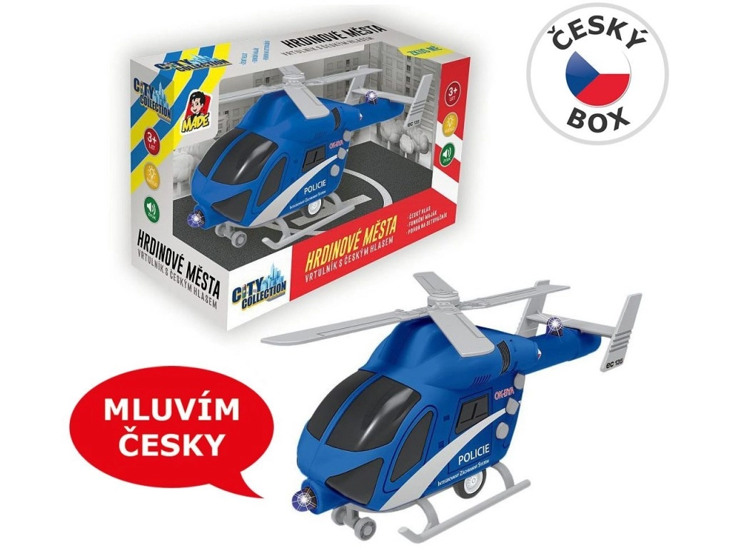 Realistlik politseihelikopter Tšehhi kujundusega rõõmustab lapsi alates 3. eluaastast. Pakub valgus- ja heliefekte, toimivat vilkurit ning tšehhikeelseid dispetšeri ja piloodi lauseid. Tänu hoorattale hakkab kergesti liikuma ja toob palju põnevat mängurõõmu.