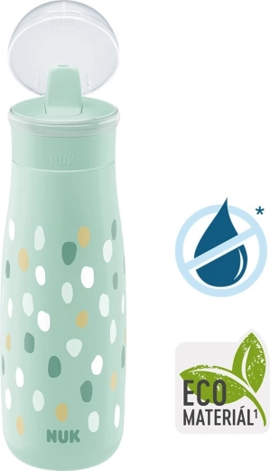 Stiilne ja praktiline laste pudel NUK Mini-Me Flip mahuga 450 ml on mõeldud lastele alates 12. elukuust. Pudelil on 2-ühes jooginokk kõrrega ja ilma, see on närimiskindel ning valmistatud 82% ulatuses jätkusuutlikest materjalidest. Pudel on lekkekindel, sellel on kaitsev kaas reisiks ja see sobib nõudepesumasinas pesemiseks. BPA-vaba, moodsa disainiga ja vastab standardile EN 14350.