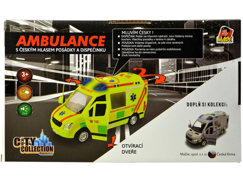 Realistlik 1:16 mõõtkavas kiirabimänguasi pakub lastele ehtsat päästeaktsiooni kogemust. Sõidab hoorattal, sellel on töötav vilkur siniste tuledega, tšehhikeelsed meeskonna ja dispetšeri teated, avatavad uksed ja komplektis patareid.