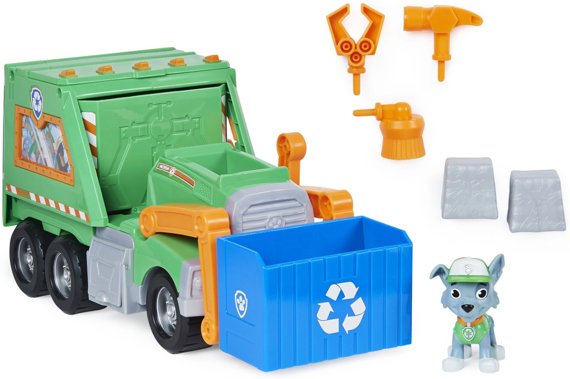 - Taaskasutusauto, Rocky figuur, sinine korv, mängulisad (“prügi” ja tööriistad)