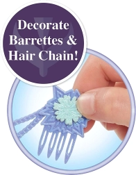 Hari, dekoratiivne juukseahel, 4 kristalli, 4 klambrit, 4 patsikummi ja 2 punumiskiudu – kõik, mida lapsed vajavad omanäoliste soengute loomiseks.