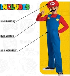 Avastage originaalne laste Super Mario kostüüm brändilt Disguise – litsentsitud toode populaarsest mängust SUPER MARIO. Ideaalne karnevaliks, maskeeritud ballile ja koduseks mänguks. Komplekti kuulub punasinine kombinesoon kollaste nuppudega, müts ja vuntsid. Suurus lastele 10–12 aastat, pikkus 137–149 cm. Materjal 100% polüester lihtsaks hoolduseks ja mugavaks kandmiseks.