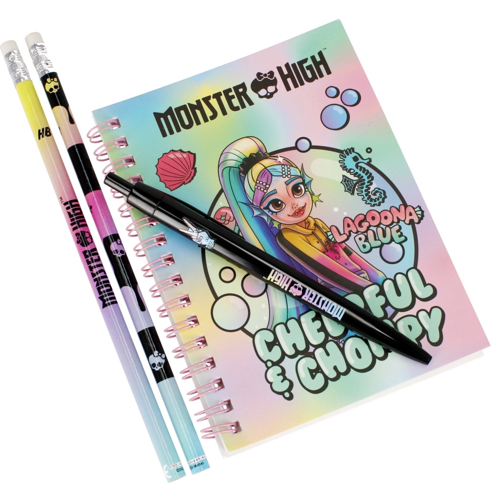 See täielik MONSTER HIGH motiiviga koolikomplekt pakub kõike, mida lapsed vajavad kirjutamiseks, joonistamiseks ja märkmete korrastamiseks. Spiraalvihiku lehti on lihtne pöörata ja need püsivad sirged, samal ajal kui läbipaistev pinal hoiab kõik vahendid koos ja korras.