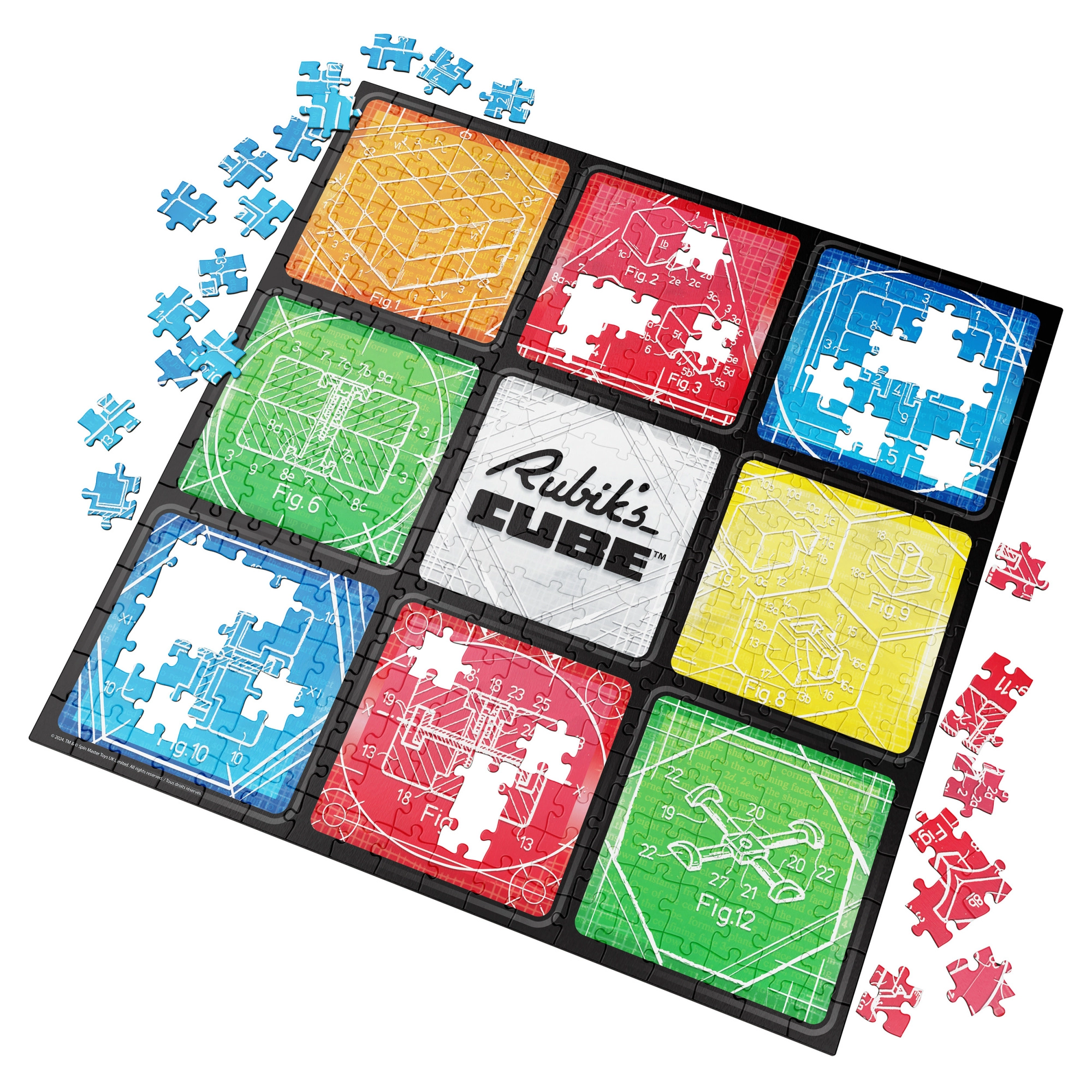 Sisu ja motiiv: Valmides saad ruudukujulise pildi 50,8 × 50,8 cm üheksa väljaga, mis viitavad klassikalisele 3×3 paigutusele. Kompositsiooni keskosa kaunistab RUBIK’S CUBE logo, ümbrust täiendavad kuulsa kuubi mehhanismi tehnilised joonised.