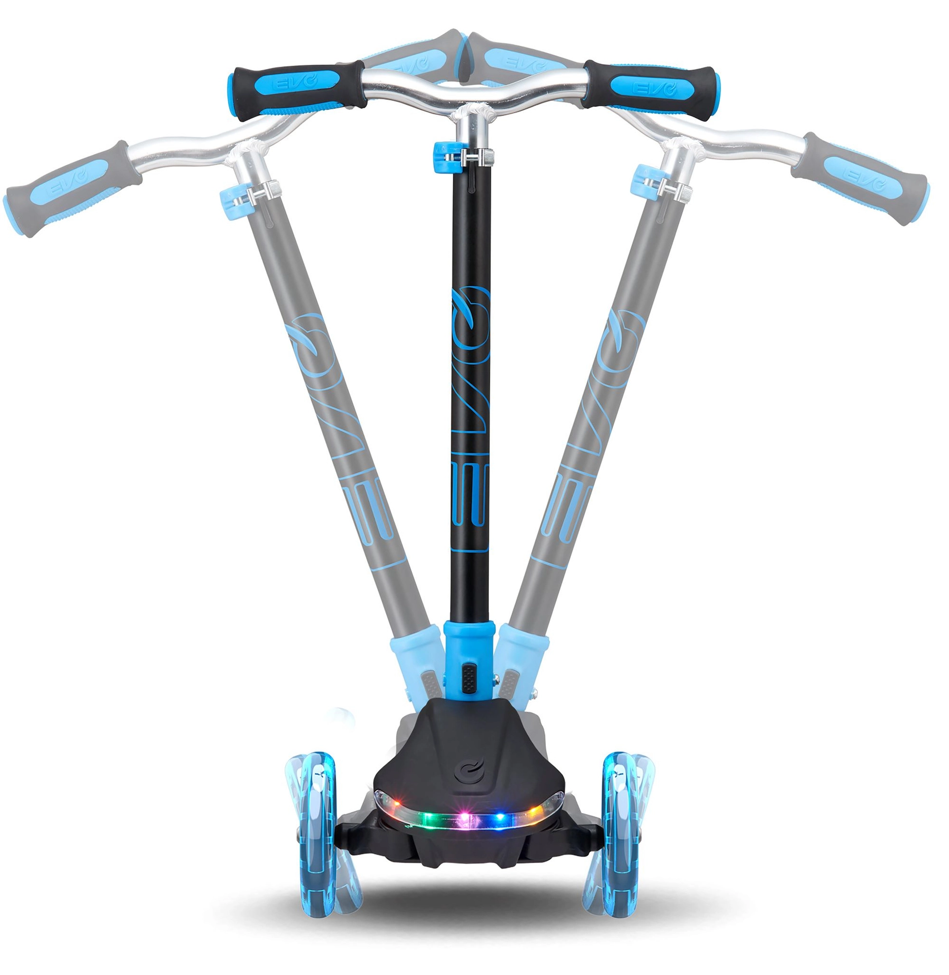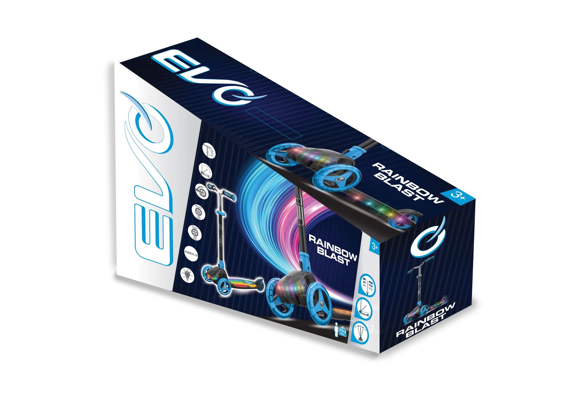 Kerge laste kolmerattaline tõukeratas EVO Rainbow Blast kõrguses reguleeritava juhtrauaga ja laia stabiilse platvormiga on ideaalne väikestele sõitjatele alates 3. eluaastast. Pakub lean-to-steer kallutamisega juhtimist, kaht suurt esiratast stabiilsuse jaoks, vaikseid ABEC-5 laagreid ja tagumist jalapidurit. Lõbu ja nähtavuse eest hoolitsevad mitmevärvilised LED-tuled platvormis.