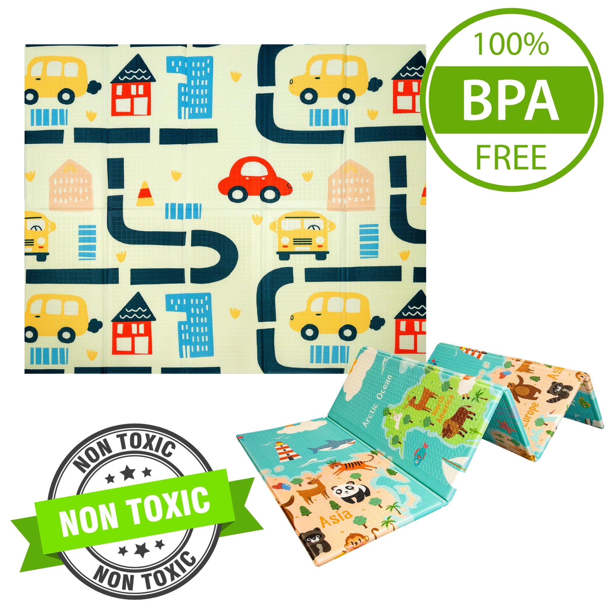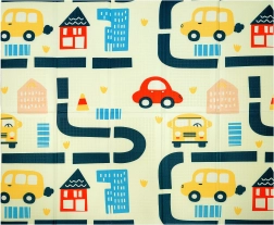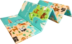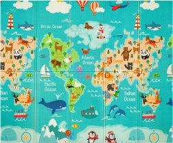 Ühel pool värviline maailmakaart ja loomad, teisel linn ja teed mänguautodele. Kaks harivat teemat ühes matis arendavad kujutlusvõimet ja teadmisi.