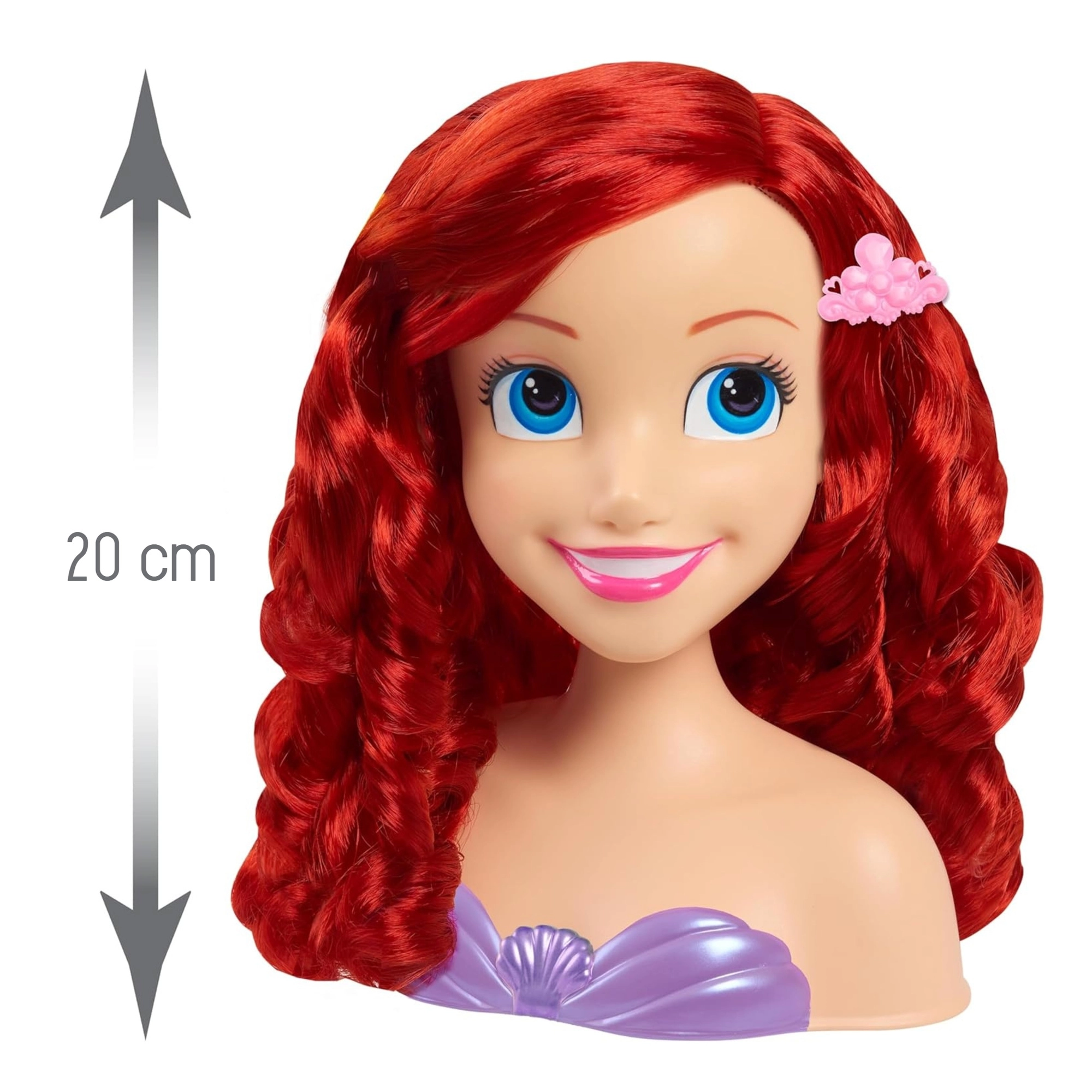 DISNEY printsess Arieli kammimispea kujutab armastatud merineitsit siniste silmade ja pikkade, lokkis punaste juustega. Stabiilne plastist torsoga alus lilla karbikujulise topiga muudab soengute tegemise mugavaks ja hoiab pea kindlalt paigal, et lapsed saaksid täiel rinnal nautida juuksurimängu.