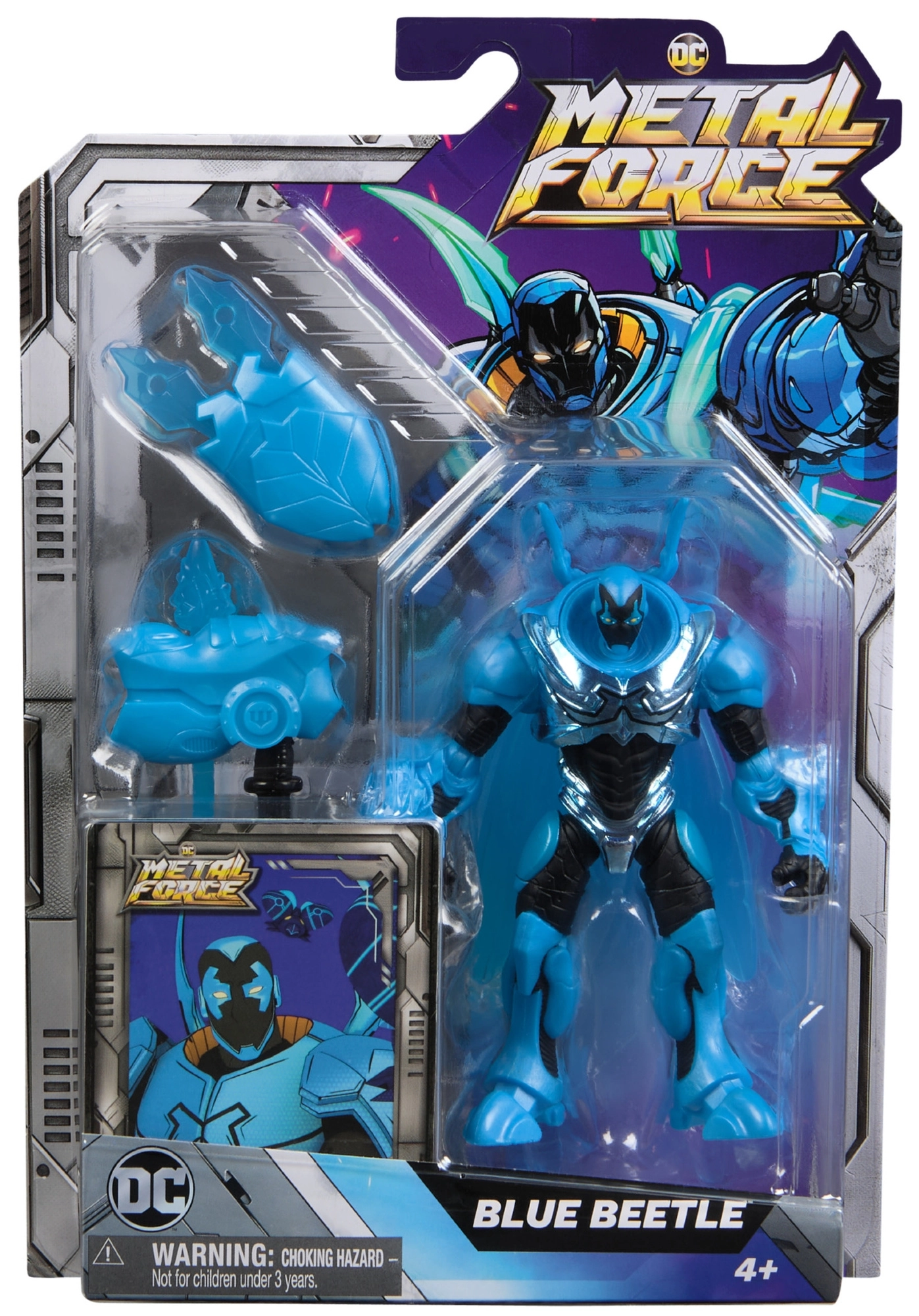 Pakendist leiad temaatilise lisavarustuse – kilbid, relva ja tiivad, mis võimendavad kujutlusmängu. Komplektis on ka tegelaskaart ja alus stiilseks väljapanekuks. Figuur on valmistatud DC ametliku litsentsi alusel ning peegeldab truult BLUE BEETLE’i välimust.