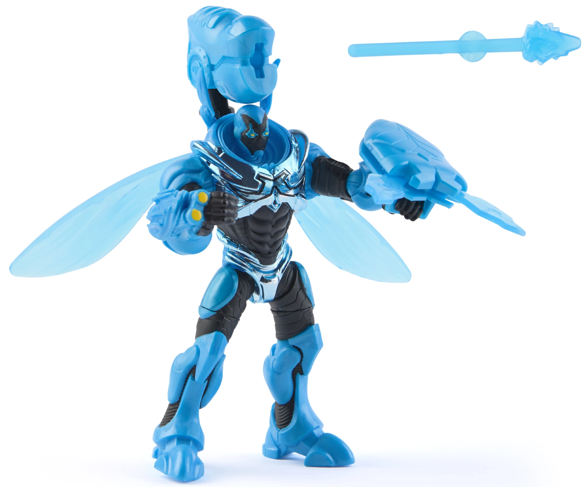 Läbipaistvad kilbid, tiivad ja relv lisavad mängule hoogu ning viitavad truult BLUE BEETLE’i varustusele.